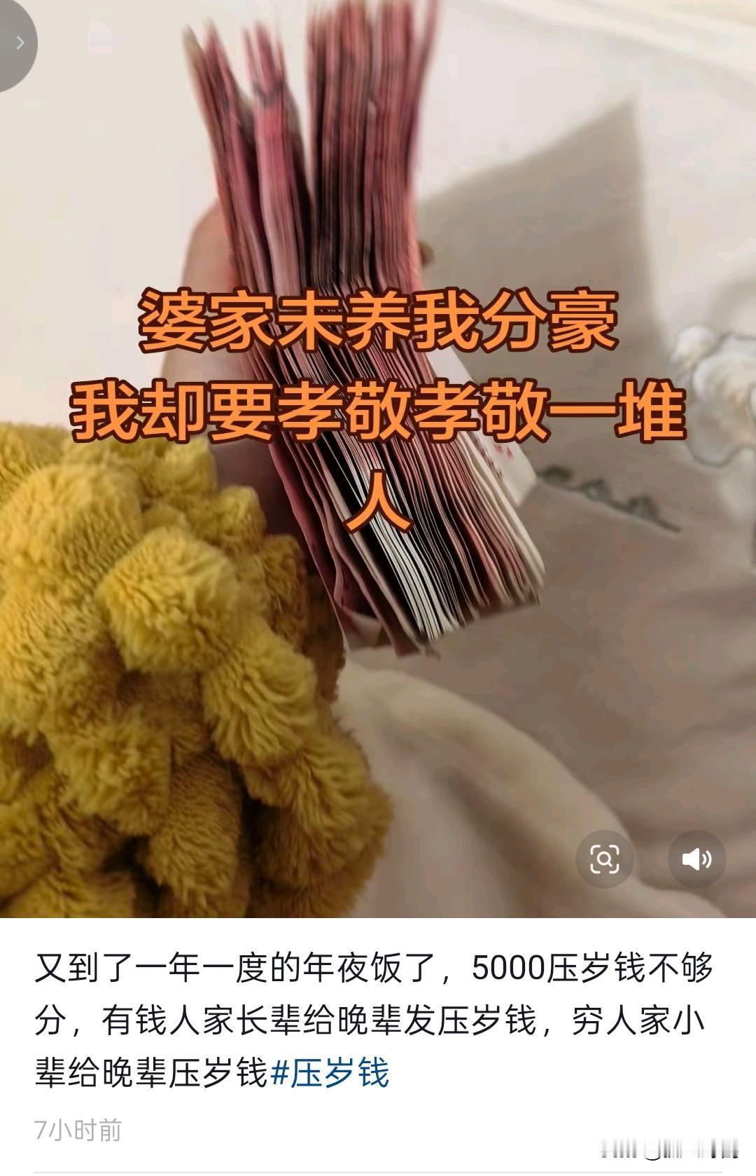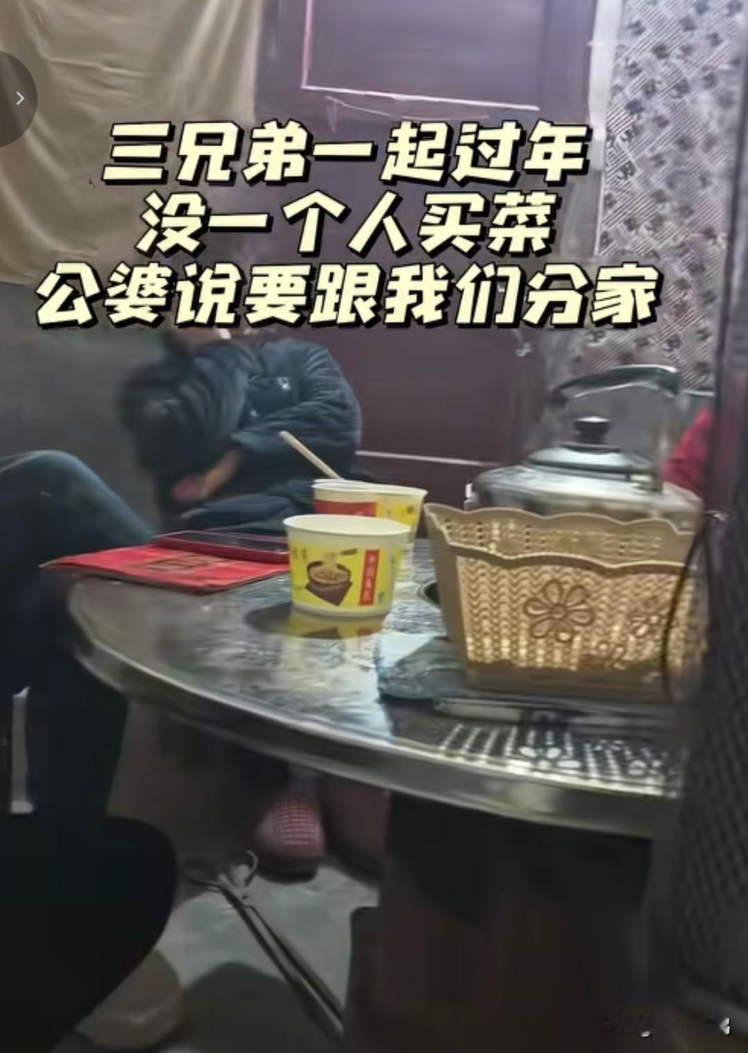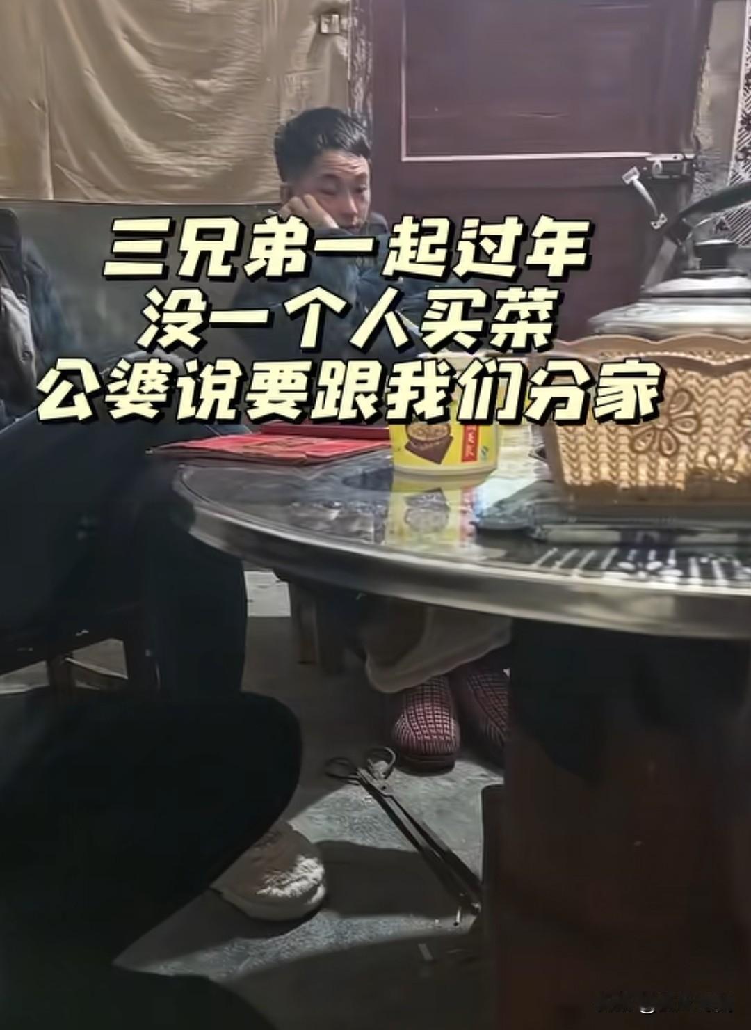 回家3天3兄弟9口人无人买年货!团圆夜公婆含泪质问:你们在等谁 2月14日,湖北一女子发布一段视频称,三兄弟一起过年,却没有一个人主动去买菜,公婆说要跟我们分家。 该女子说,分家是不可能分的,因为三兄弟就一个房子,都是住在一起的,如果分家的那么要分到哪里去呢? 所以,分家是不现实的,于是团圆夜公婆含泪质问:你们在等谁?等着我们老两口去买年货供你们3兄弟9口人饭菜? 这个年要一起过,你们一家要不出5000块钱,我们一起过年,要么打包回家,各过各的年。于是,女子不愿出这个5000元,她觉得5000太多了。 所有就有了这段视频,她询问广大网友们,要是你们的话会选择那个?分家自己过?还是出5000元一起过年? 看下图,三兄弟的父母找他们谈话,询问这个年到底怎么过给句准话,而三兄弟却装聋作哑一个都不回应,桌子上还摆放的刚吃完泡面桶,看到这里,也真够无语的,宁愿吃泡面,也不愿意花几个钱去买菜,难道回家过年就是打秋风的吗?难怪三兄弟父母如此气愤。 连分家的话都说出来了,看到这一幕,真为老人晚年感到担忧,有这样的三个儿子,以后的日子会很难。 希望老人多存点钱,晚年会好点。 对于此事,你怎么看?