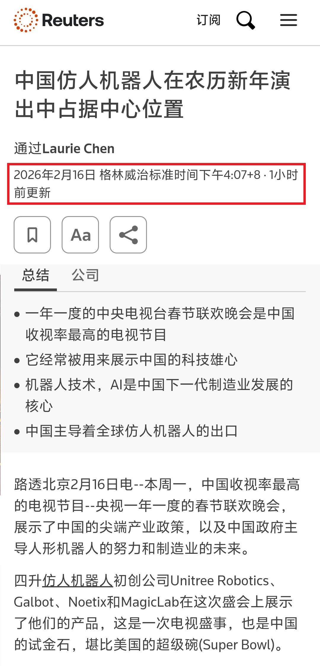 国外动作真快,路透社已经报道春晚机器人了! 今年的春晚凸显了两个主题:机器人和人工智能。整个春晚弥漫着机器人的气息,堪称我国最新机器人的科技风向标。 这股风刮得太猛,以至于春晚还在进行中,路透社关于春晚机器人的报道就出来了! 如果以前还有人对机器人有点怀疑的话,那么今年春晚过后,看到一年时间机器人的进化程度,怀疑应该消失了。 机器人这个领域,我国已经把西方国家远远甩在身后,他们肯定时刻关注我国动态,要说不紧张那是不可能的!