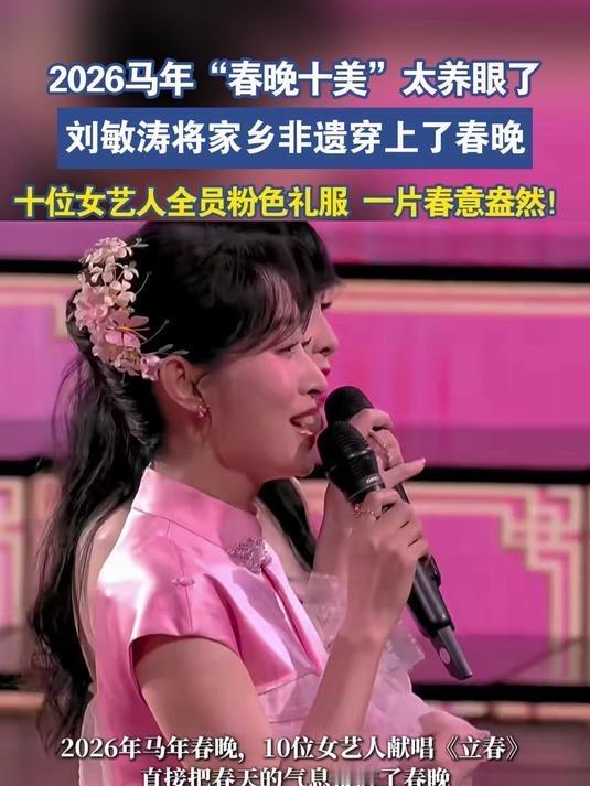 春晚十美好养眼!央视这波审美直接封神,看完谁不感叹:这才是中式美人该有的样子! 2026马年春晚一开播,《立春》舞台瞬间炸场。周慧敏、刘敏涛、梁咏琪、秦海璐、薛凯琪、张钧甯、姜妍、热依扎刘惜君、希林娜依·高,十位女神同框没有浓妆艳抹,没有夸张造型,一袭柔粉长裙,往那一站,就是一整幅春日画卷。 58岁的周慧敏春晚首秀,状态好到让人尖叫。岁月仿佛忘了她,一颦一笑还是当年的玉女模样,温柔得能掐出水,直接把全网拉回青春回忆杀。刘敏涛飒爽大气,梁咏琪清逸知性,秦海璐沉稳有韵,每一位都自带气场,美得各有千秋 薛凯琪甜而不腻,张钧甯灵动优雅,姜妍温婉可人,热依扎舒展大方,刘惜君空灵治愈,希林娜依·高青春闪耀。十位美人,横跨几代人的青春,有岁月沉淀的韵味,有正当红的惊艳,有新生代的朝气,凑在一起,就是不内卷、不攀比的中国式团圆之美。 央视镜头从不开美颜,却把每个人的光彩拍得恰到好处。没有锥子脸,没有过度滤镜,真实、舒展、大方,这才是最打动人心的美。她们站在舞台上,唱的是立春,展的是国风,传递的是自信与从容。 网友纷纷刷屏:“这才是春晚该有的颜值!”“十位美人,十全十美,马年开年就被治愈了!” 没有拉踩,没有艳压,只有各司其美、相得益彰。这不仅是视觉盛宴,更是一种审美回归:真正的美,从来不是千篇一律,而是各放光芒。 今年春晚十美,你心里的Top1是谁?是惊艳时光的周慧敏,还是气场全开的刘敏涛,或是灵动甜美的薛凯琪?评论区赶紧pick,为你心中的白月光打call!