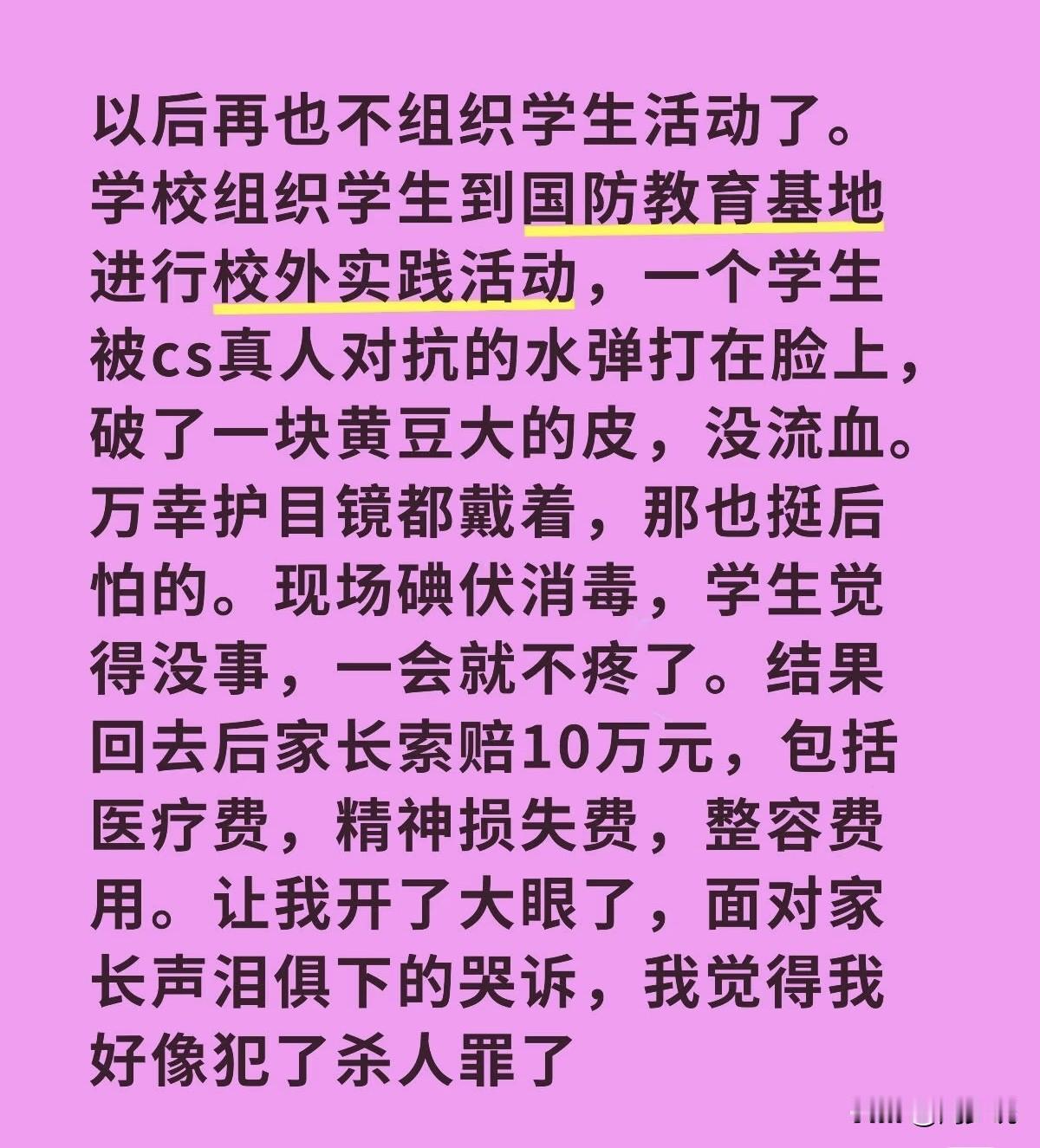 “以后再也不组织学生活动了!”北京,一位老师的吐槽,在网上引发无数同行共鸣。学校组织学生前往国防教育基地开展实践活动,原本是件增长见识的好事,却差点让老师陷入两难。 活动中,一名学生在真人CS对抗时,被水弹轻微打到脸部,只是破了一块黄豆大小的皮,连血都没流。好在大家都戴着护目镜,没有伤到眼睛,老师当场就用碘伏做了消毒,孩子自己也说不疼了,状态一直很正常。 谁也没想到,活动结束后,家长直接找上门,提出10万元赔偿,包含医疗费、精神损失费、后续整容费等。看着家长情绪激动地诉说,这位老师直言,自己那一刻好像犯下了天大的错。 此事一出,网友们吵翻了。有人说:“老师真是太难了,组织活动担惊受怕,出一点小事就被无限放大。” 也有人表示:“理解家长心疼孩子,但索赔10万,确实有点超出常理”。 在周少看来,很多老师看到这事,第一反应都是心寒。现在带学生外出活动,校方和老师要做的准备越来越多,安全预案、人员分工、全程看护,几乎不敢有半点松懈。可即便如此,依然挡不住意外发生。 孩子娇贵可以理解,但过度追责、动辄高额索赔,反而会寒了认真负责的老师的心。久而久之,不少学校、老师干脆选择少组织、不组织校外实践,最后吃亏的,其实还是渴望开阔眼界的孩子们。 教育本就不该只停在教室里,适当的实践、磕碰,也是成长的一部分。家长和学校之间,多一点理解,少一点苛责,老师才敢放心带孩子去看更大的世界。 总之,周少始终觉得真正的保护,从来不是把孩子圈在温室里,而是教会他面对小风浪,也给负责的人多一点空间。#寻美三湘#