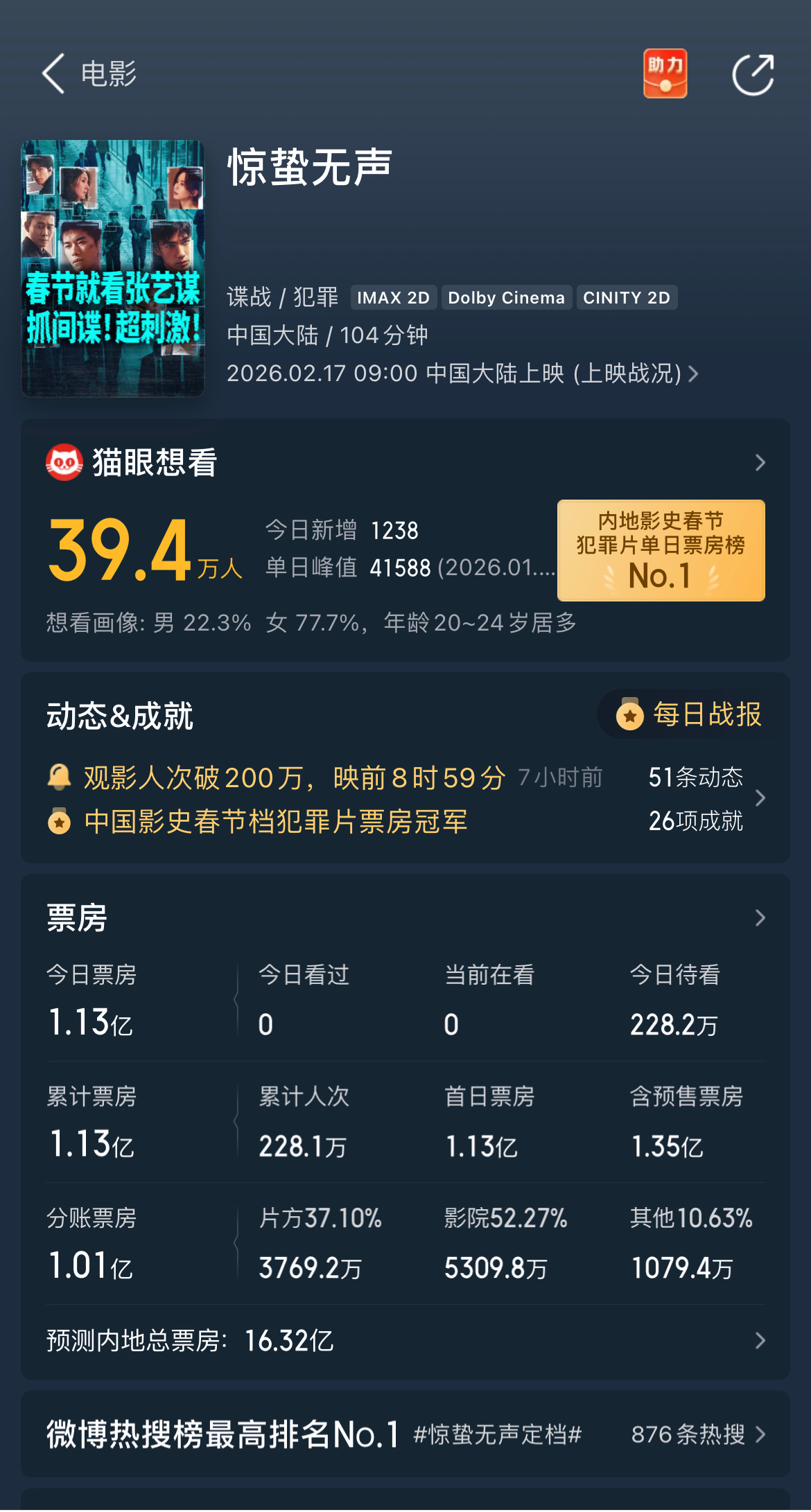虽然上映第一天,口碑还不知道,但预测票房已出,《惊蛰无声》预测票房16亿➕,灯塔预测21亿➕,一般会根据口碑好坏虽然调整。期待刘诗诗的小玉刘诗诗惊蛰无声