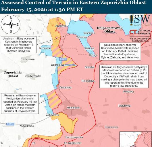 图文:乌军在扎波罗热的反攻行动在一周内夺回9.5公里阵地 俄罗斯在扎波罗热州推进了两个月——乌克兰一周内夺回9.5公里阵地。 反击行动迫使俄军撤离十多个定居点,并打乱了假设中的奥里希夫-扎波罗热行动的时间表,不过乌克兰军事观察员马绍茨警告称,乌克兰缺乏力量进行战术稳定以外的行动。 乌克兰军队通过战术反击在部分地区将俄军后撤至9.5公里处,并解放了扎波罗热州的十余个定居点,据战争研究所(ISW)援引乌克兰军事观察员马绍茨的说法,此举可能阻碍了俄罗斯为夏季可能发动的扎波罗热市攻势所做的准备。反击行动可能利用了俄罗斯失去星链系统接入机会,但马绍茨警告称这些仅为有限的稳定行动,而非反攻。 自2022年以来,俄罗斯已占领该地区约80%的领土,并持续施压以夺取剩余区域——在战场上,美国战争研究所(ISW)指出俄罗斯的南部轴心目标为推进至扎波罗热市管状火炮射程内;在外交层面,莫斯科则敦促美国迫使乌克兰放弃顿涅茨克州及其他2022年非法吞并的地区,包括扎波罗热州。 俄军在奥莱克桑德里夫卡和胡莱什波列方向发动攻势约两个月,攻占胡莱什波列并向西和西北推进。马绍维茨于2月15日报告称,2月8日左右,这些攻势的节奏急剧放缓,随后几乎停滞。 乌克兰军队随后从多条战线发起攻击。在奥莱克桑德罗夫卡东南方向,他们将俄军逐出奥列克西夫卡和奥列斯托皮尔,并向别列佐夫和特尔诺韦推进。沿扬丘尔河,他们解放了维什涅韦、叶霍里夫卡、佩尔绍特拉夫内韦、兹拉霍达和里布内,并开始争夺普里维尔内。 在Huliaipole西北部,乌克兰军队将俄罗斯军队从Ternuvate和Kosivtseve赶走,渡过Haichur河,解放了Dobropillia——截至2月14日,已经在其以东发现了部队。在平行推进中,他们清除了Pryluky和Olenokostiantynivka,再次越过Haichur,并开始为Varvarivka而战,其中一部分似乎已经在乌克兰的控制之下。 在Tsvitkove-Zaliznychne线沿线,反击停止了,但并没有扭转俄罗斯的前进。俄罗斯军队控制了扎利兹尼赫内和茨维特科夫东郊,但在一周多的时间里没有进一步推进。俄罗斯仍然沿着从Dorozhnianka到Zaliznychne的铁路向北推进1.2公里。 在俄罗斯第58联合兵种军的区域内,乌克兰军队将俄罗斯部队推回普里莫尔斯克、卢基扬诺夫斯克和斯捷普诺希尔斯克附近,并阻止了俄罗斯沿斯捷普夫-帕夫利夫卡轴线的推进。