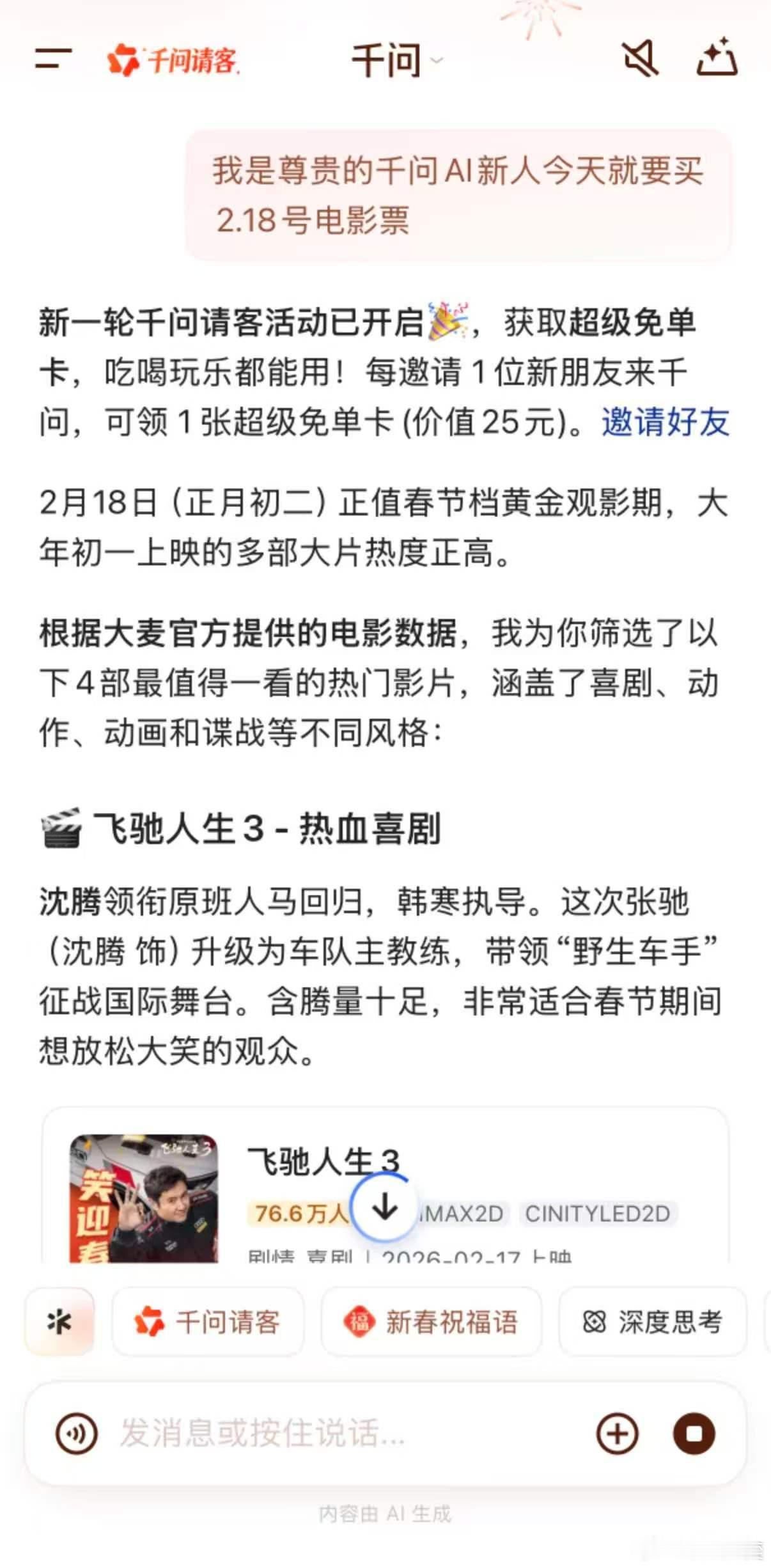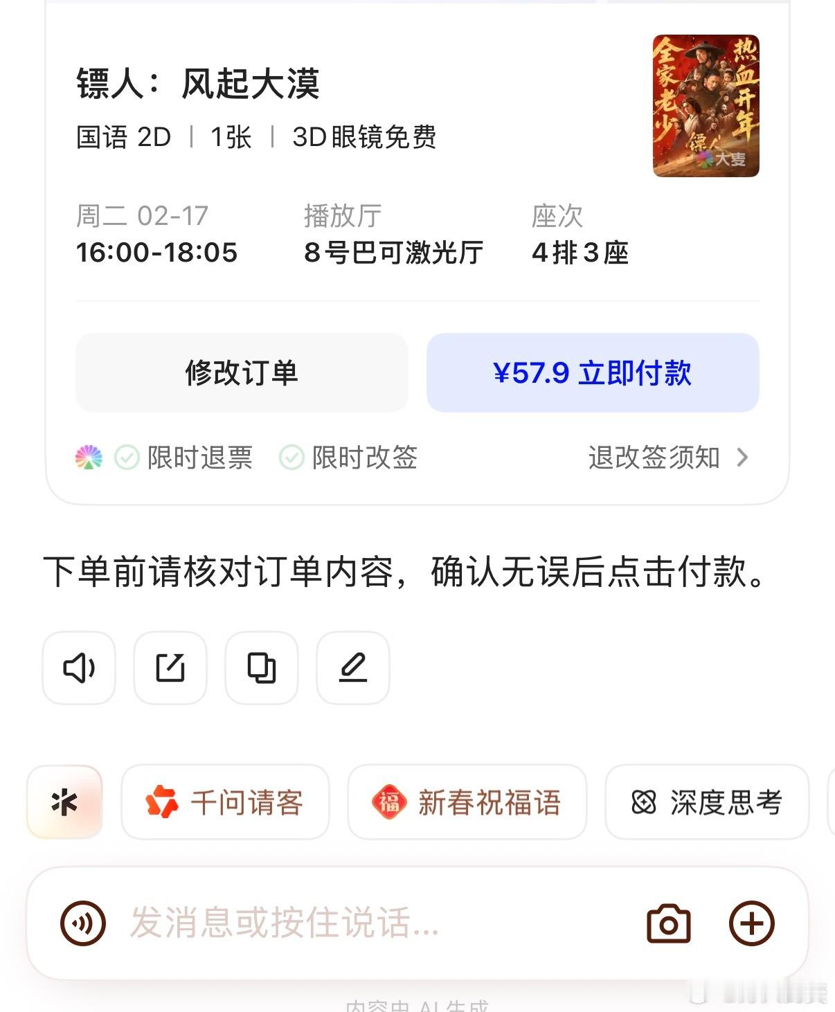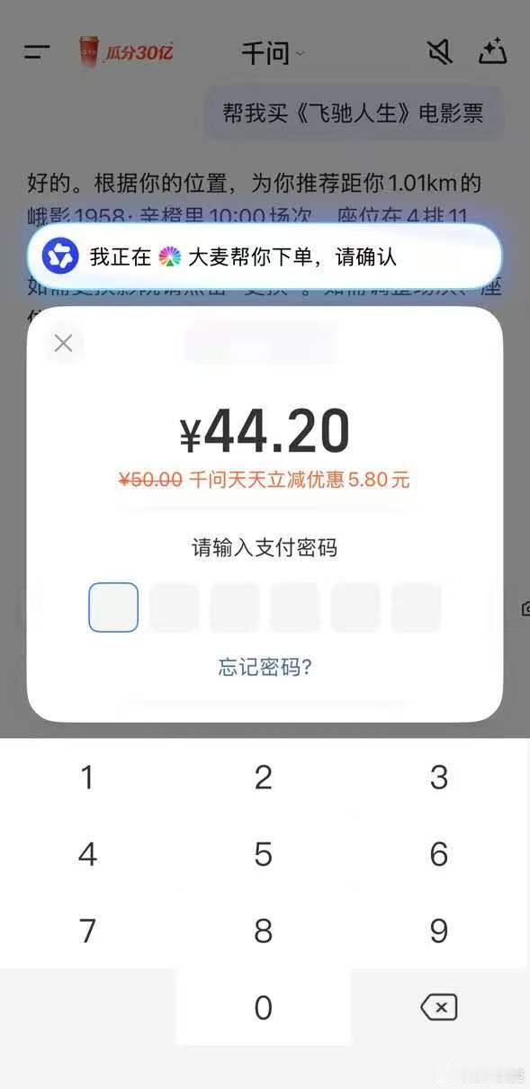 这两天打算“住在”电影院了,每一场都能有减免,直接给千问发一句话就能完成“选品-选择-支付”全过程。