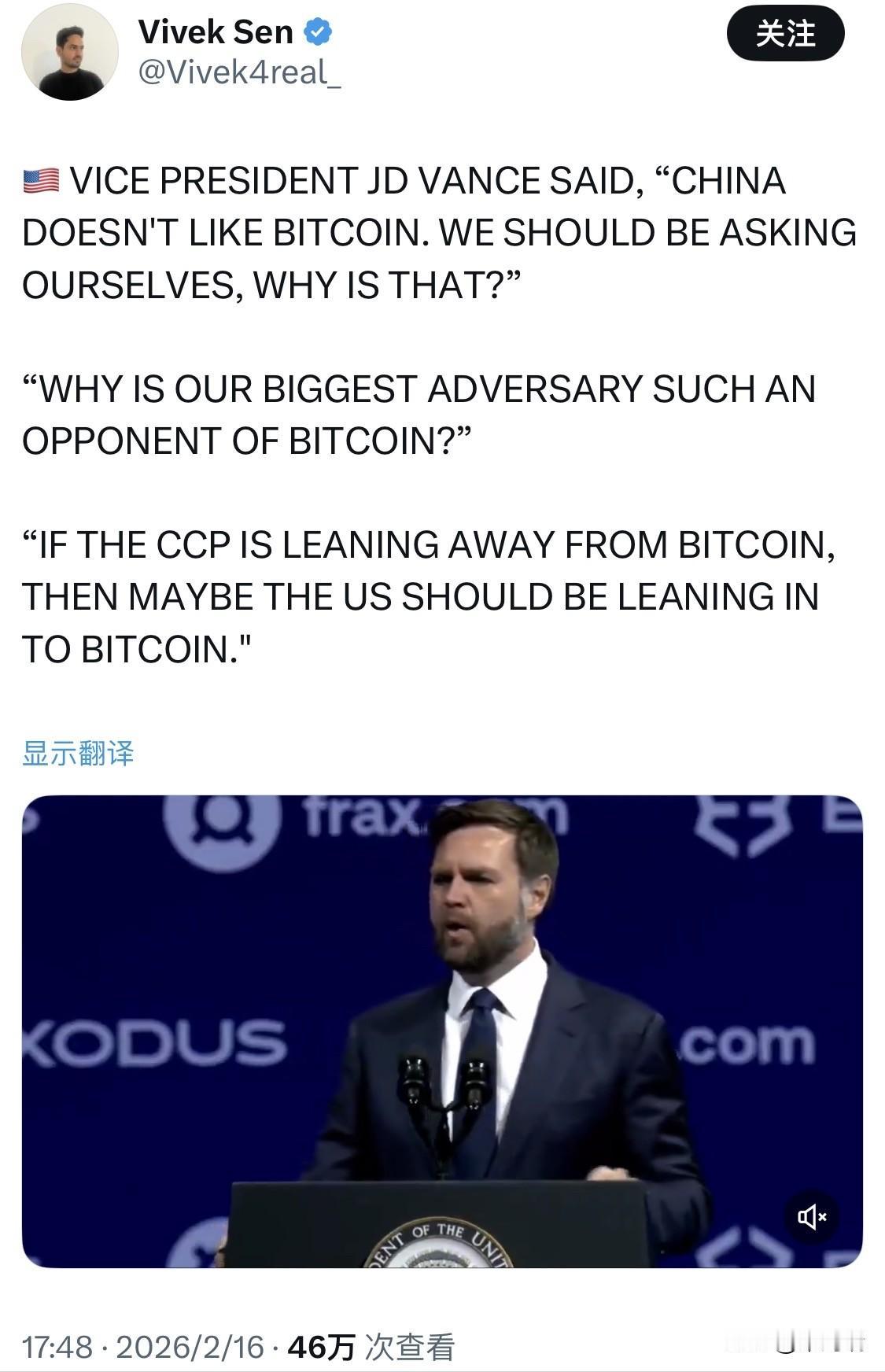 美国副总统万斯说:“中国不喜欢比特币。我们应该问问自己,这是为什么?” “为什么我们最大的对手如此反对比特币?” “如果中国正在远离比特币,那么美国或许应该转向比特币。 这是美国副总统J.D. 万斯(JD Vance)于 2025 年 5 月 28 日在拉斯维加斯举行的 2025 比特币大会(Bitcoin 2025)上发表的主旨演讲内容。 在演讲中,万斯将比特币提升到了国家战略的高度,并阐述了以下核心观点: 将比特币视为战略优势:他认为,如果中国(美国最大的竞争对手)对比特币持反对和远离的态度,那么美国恰恰应该抓住这个机会,“转向”并“倾斜”于比特币,以在数字资产领域建立竞争优势。 国家安全与经济实力:万斯称比特币为“国家战略问题”,并表示特朗普政府认为稳定币等数字资产是美国经济实力的“倍增器”,而非美元地位的威胁。 支持政策落地:他提到特朗普政府已通过行政命令建立国家比特币战略储备,并致力于通过立法(如《GENIUS 法案》)来规范和支持加密货币行业。 背景补充: 中国自 2021 年起已全面禁止虚拟货币相关的业务活动,包括交易和挖矿,理由是防范金融风险、维护货币主权以及保护环境。而万斯本人也是比特币的持有者,在 2024 年的财务披露中显示其持有价值 25 万至 50 万美元的比特币。