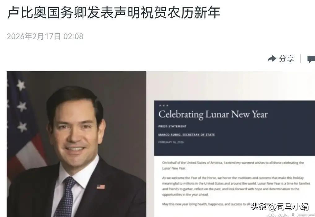 美国政客卢比奥(注:卢比奥为美国联邦参议员,并非国务卿)于2月16日农历除夕夜送上春节祝福,然而全文未提及“中国”二字。 自上世纪70年代中美建交以来,美国总统或国务卿在每年中国除夕向中国致辞已成为惯例。但今年卢比奥的致辞别具一格,他在国务院官网上发布的新年贺词称:“向所有庆祝农历新年的人们致以最热烈的祝福”。在我看来,卢比奥这则新年贺词并非面向中国,反倒像是面向东南亚地区。