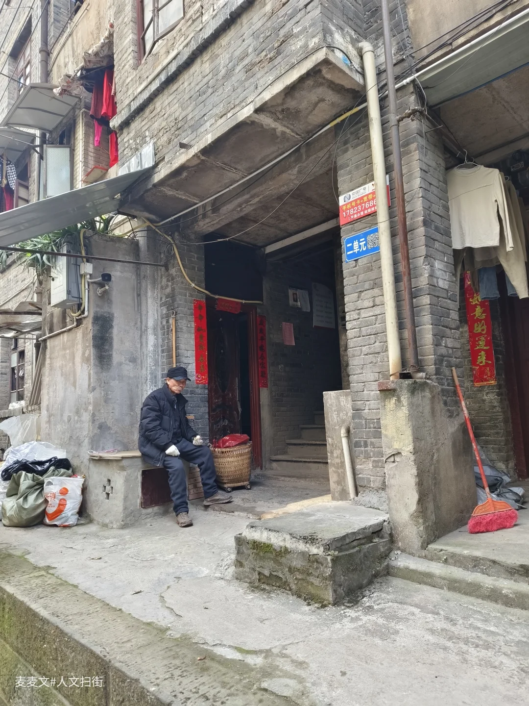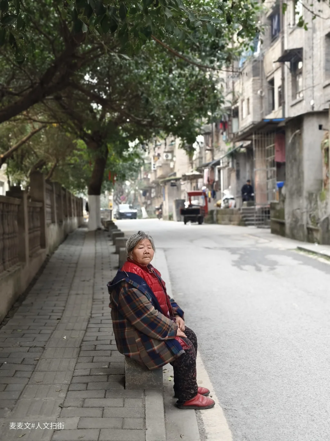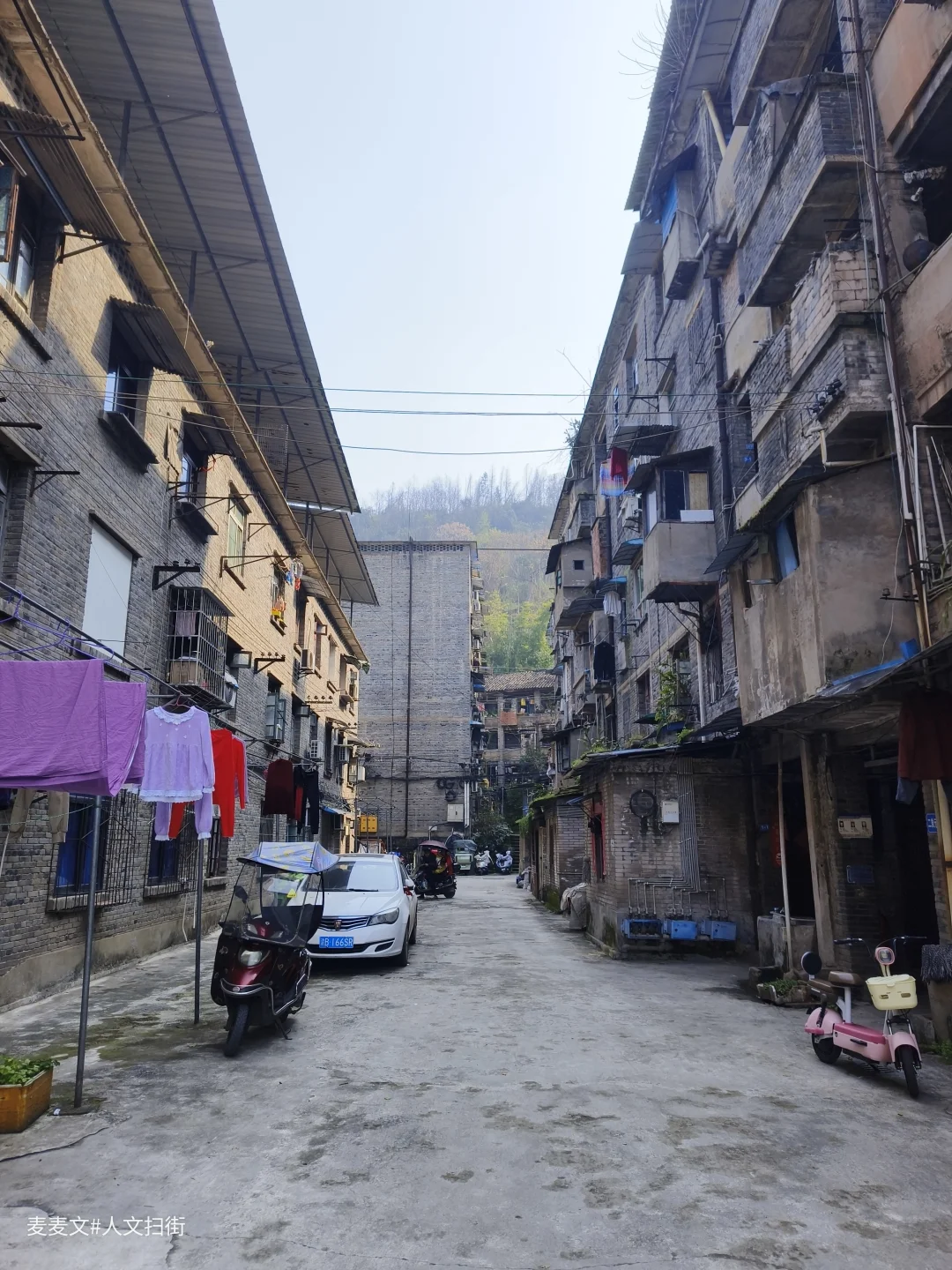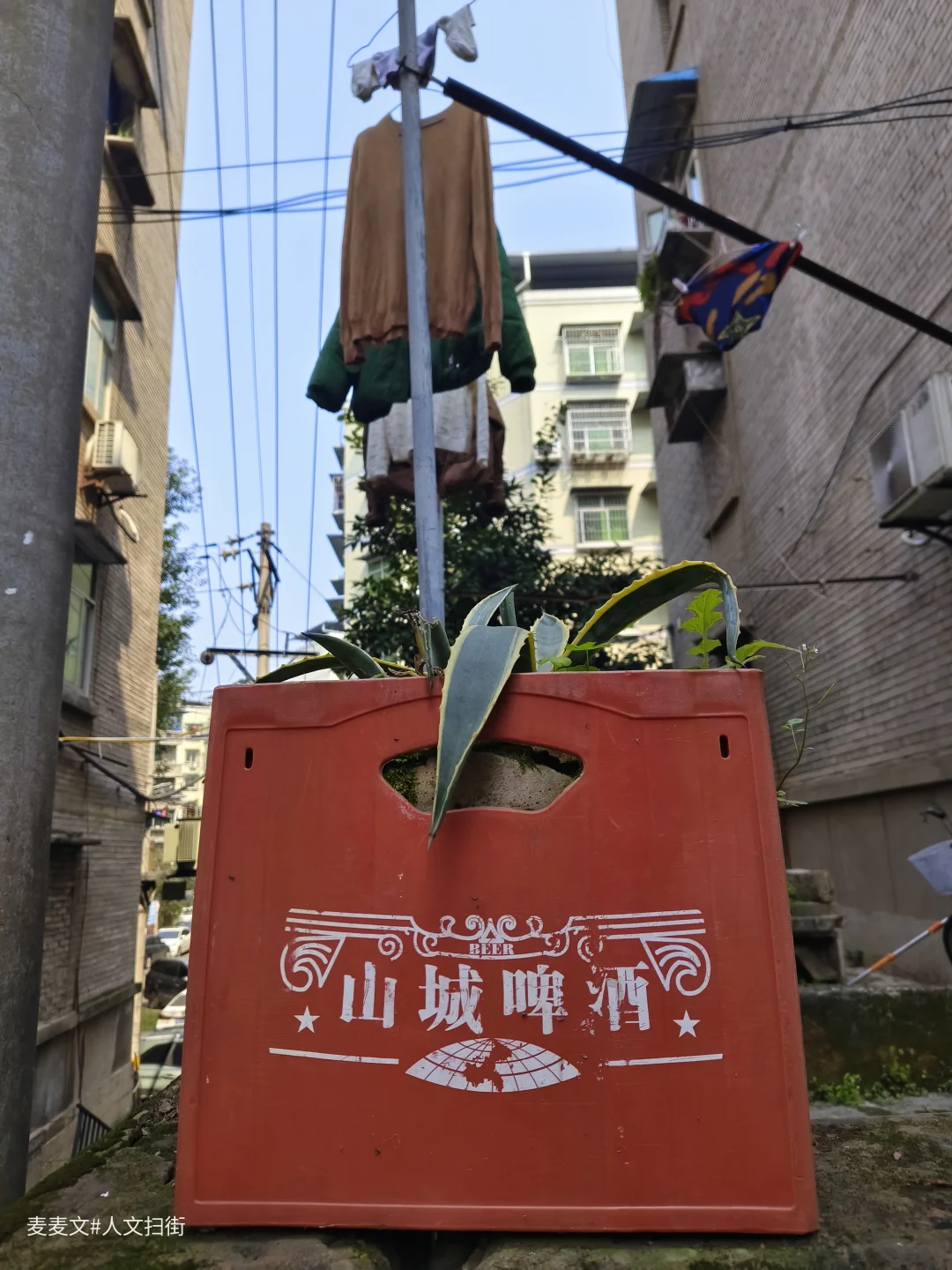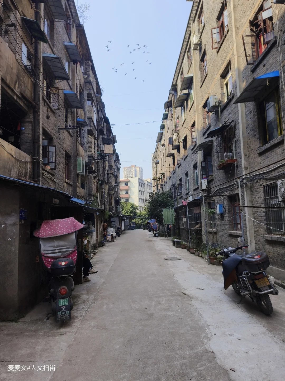 走在巷子里,晾晒的衣物、门口的盆栽、停在路边的电动车,还有偶尔走过的身影,都让这条老街依然鲜活。远处的高楼与近处的老楼形成鲜明对比,像一条时光的分界线。