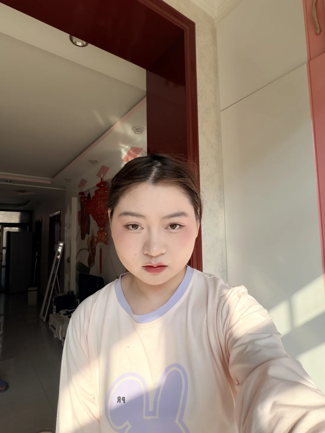 今天在家练习妆容,明天打算去阿勒泰拍照,现实中腮红有点红 ,不知道这个腮红位置对不对 ,路过的姐妹们有建议吗,