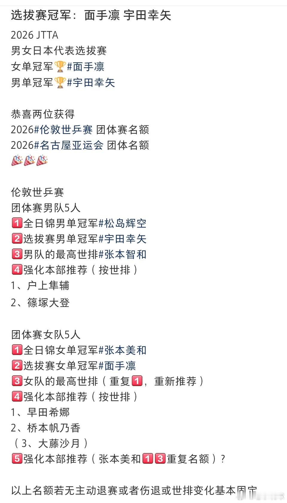 男团,张本智和,松岛辉空,宇田幸矢,户上隼辅,大登女团,张本美和,面手凛,早田希娜,大藤沙月,桥本帆乃香
