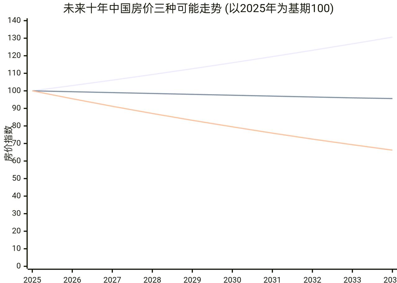 房价未来十年走势:三种可能路径,哪种走势概率最大? 三种走势详解: 1.震荡上行(概率约30%)未来十年中国房价最可能呈现以下三种走势。这张图表直观展示了不同情境下的房价变化趋势。 三种走势详解 震荡上行(概率约30%) 核心城市稀缺资产(如一线城市核心地段、优质学区房)在通胀预期和经济复苏推动下,呈现温和但持续的上涨。年均涨幅预计在2-4%,跑赢通胀但远非过去暴涨模式。 分化调整(概率约55%) 这是最可能出现的情景。市场剧烈分化:核心区域微涨,非核心区域阴跌。整体房价指数可能横盘或微跌,但不同城市、不同板块的价差会持续拉大。 持续阴跌(概率约15%) 若经济面临超预期挑战或政策调控出现重大转向,全国房价可能进入漫长的价值回归通道。非核心城市及远郊房产年均跌幅可能达3-6%,直至触及新的供需平衡点。 核心城市稀缺资产(如一线城市核心地段、优质学区房)在通胀预期和经济复苏推动下,呈现温和但持续的上涨。年均涨幅预计在2-4%,跑赢通胀但远非过去暴涨模式。 2.分化调整(概率约55%) 这是最可能出现的情景。市场剧烈分化:核心区域微涨,非核心区域阴跌。整体房价指数可能横盘或微跌,但不同城市、不同板块的价差会持续拉大。 3.持续阴跌(概率约15%) 若经济面临超预期挑战或政策调控出现重大转向,全国房价可能进入漫长的价值回归通道。非核心城市及远郊房产年均跌幅可能达3-6%,直至触及新的供需平衡点。 决定最终走向哪条路径,主要看以下几个“开关”: 人口流动:年轻人持续向长三角、珠三角等都市圈聚集,是支撑“分化”逻辑的核心。 政策定力:“房住不炒”的长期执行力度,决定了是“托底”还是“刺激”。 经济增速:居民收入增长预期直接影响购买力和信心。 土地财政转型:地方政府对土地收入的依赖度能否降低,关乎供应端的根本变化。 简单来说,未来买房更像“选股”,普涨行情不再。资产价值将更紧密地与具体城市的产业、人口和资源绑定。