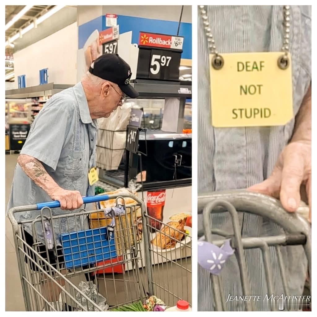 这张图片记录了一位老先生在沃尔玛超市(Walmart)购物的感人瞬间,他在脖子上挂着一块牌子,上面写着“DEAF NOT STUPID”(耳聋不等于愚蠢)。 事发地点:沃尔玛超市。 当事人:一位穿着牛仔衬衫、手臂上有褪色纹身的老人。 标识牌:老先生佩戴的牌子是用纸板手工制作的,上面的字迹虽然有些颤抖,但表达出的态度非常坚定。 这张照片在多个社交平台上引发了广泛共鸣和讨论: 尊严与呼吁:由于他有听力障碍,在结账排队时偶尔会引起他人的不耐烦。这个牌子是他对尊严的捍卫,提醒周围的人:他只是听不见,但这并不意味着他理解能力或智力有问题。 社交反响:该照片在 Reddit、Facebook 和 9GAG 等平台被大量转发。许多网友评论称,这一幕让人感到既心酸又充满敬意,甚至有类似经历的人表示也想佩戴类似的标识,以减少误解和被粗鲁对待的情况。 人性关怀:有网友分享了在停车场遇到这位老人的经历,提到他表现出的坚韧和不屈令人深受感动。