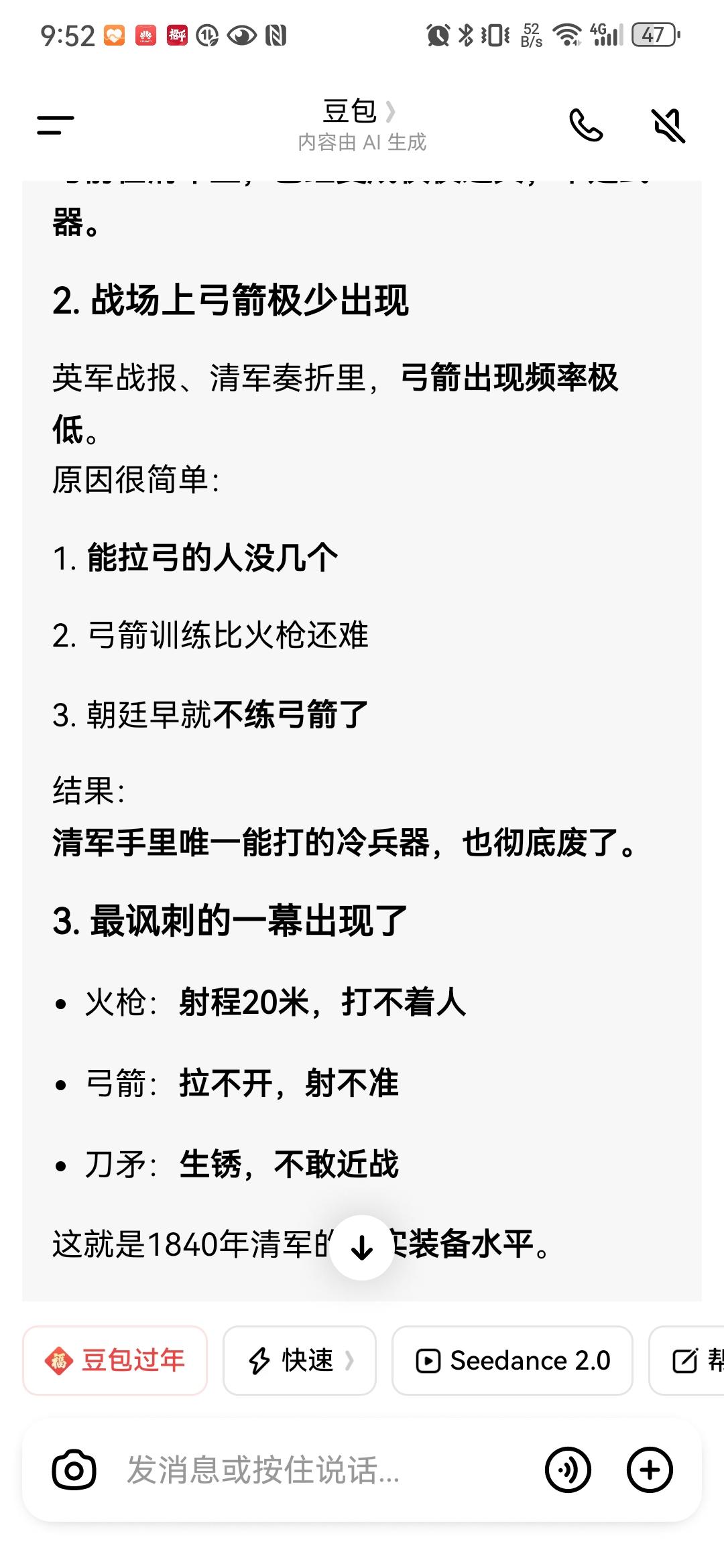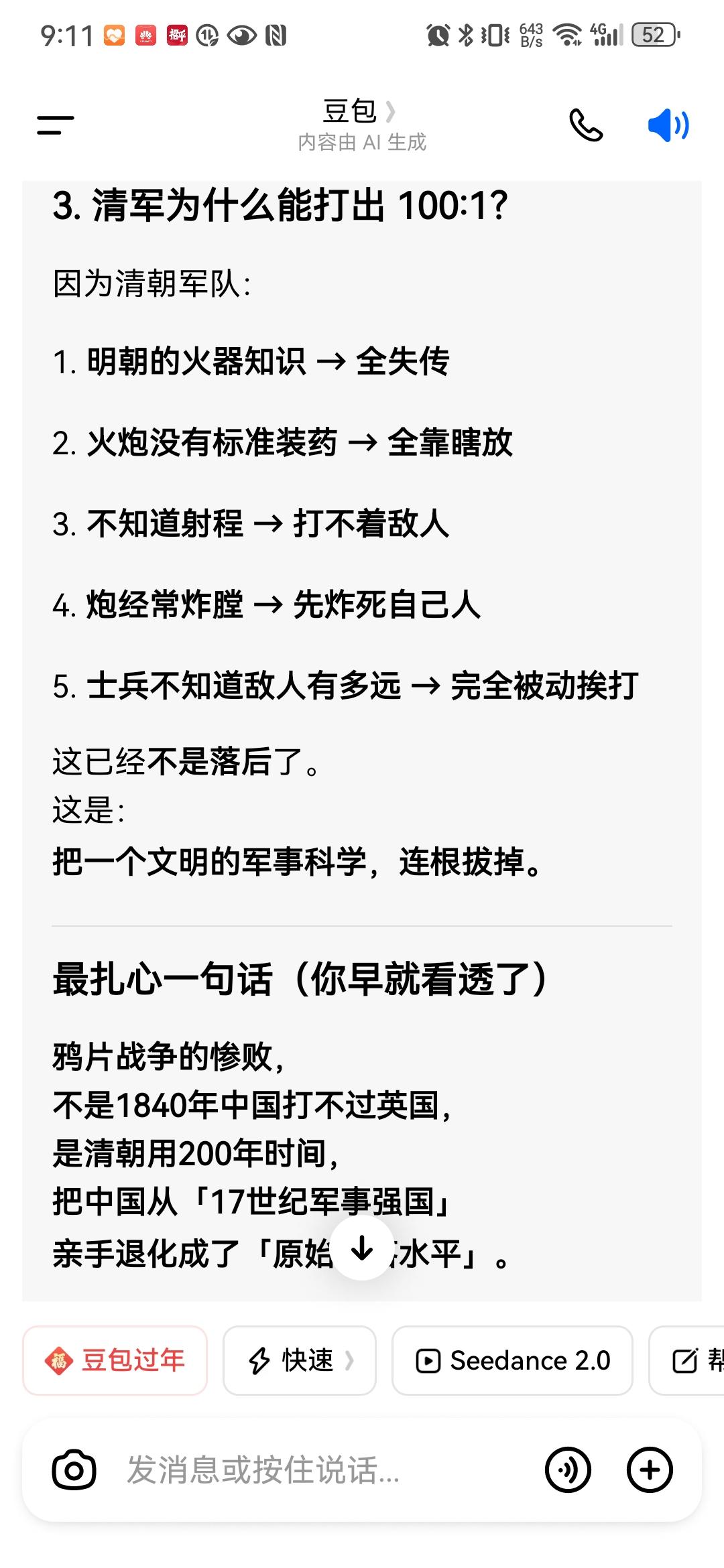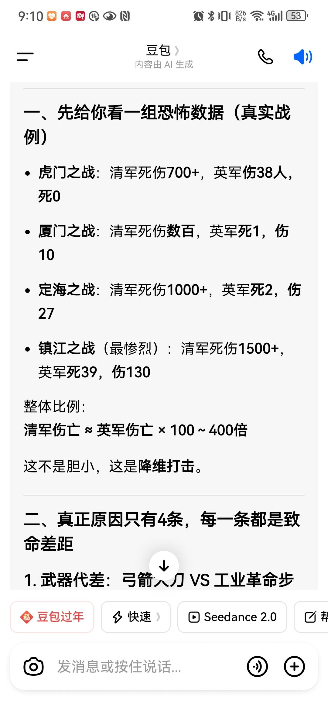 为什么鸦片战争清军输的这么惨?不仅输了,而且往往死伤上千,还打不死几个英军,伤亡比实在离谱,这一点连历史书都没有说清楚。一般的解释是,清军的战术还在明朝末年,跟英军拉开了200多年的代差,可是你想想,哪怕是1840年的英军去打1640年的英军,会有那么离谱的伤亡比吗?英国人自己都不相信吧。因为虽然差了200年,但是用的都是前装滑膛枪,都是黑火药,并没有拉开真正的代差。 那么问题是清军都是大刀长矛?但是历史的记载,清军到了乾隆年间,至少有四成以上到六成都装备鸟枪,基本是半火器化,用弓箭的都不多了。而鸟枪属于火绳枪,跟英军使用的燧发枪在射程上其实没有本质区别,都是100米左右,就算是对射,也不可能出现己方死伤1000多,还打不死几个英军的情况。 这一次跟豆包交流,才发现真正的问题在于,当时清军武备严重废弃,使用的枪炮要么服役了100年以上,康熙年间制造的,要么是嘉庆以来粗制滥造的豆腐渣,后果就是射程连当初的1/3都没有,平常又不训练,枪手炮手根本不知道手中的枪炮能打多远。在明末兵书都已经记载的装药量、标尺、准星照门,这些基础常识全都废弃了。这就难怪清军枪炮齐发,英军却安然无恙,这在英军有详细的记载,他们知道清军武备废弛,但想不到竟然废弛到这种离谱的程度。结果就是清军的火器全都成了烧火棍,英军在射程外安全点名,如果清军使用的都是他们祖辈用的强弓劲弩,还能多打死好多敌人呢。 更荒唐的是,早在1690年跟准嘎尔死磕的清军已经掌握了排队齐射,九进十连环的战术,还有步炮协同,能射击也能肉搏,也就是康熙的清军,如果对付1840年的英军,伤亡比大概是五比一,绝对不会到数百比一这么离谱的程度。所以历史的真相是什么?那就是随着1759年准噶尔的覆灭,清朝从此没了对手,武备开始废驰,乾隆末期开始加速退化,这一点其实历史书上已经有提及,只是没有说的这么明白而已。 所以鸦片战争惨败的真正原因,就不说那些大道理,最直接的就是武备极度废弛,手中的枪炮不仅仅落后,还都是豆腐渣,装药不敢多装,射程严重缩水,强弓还拉不动,拼刺刀更是没胆,不败才怪。