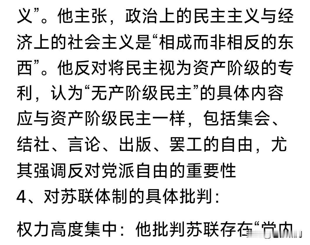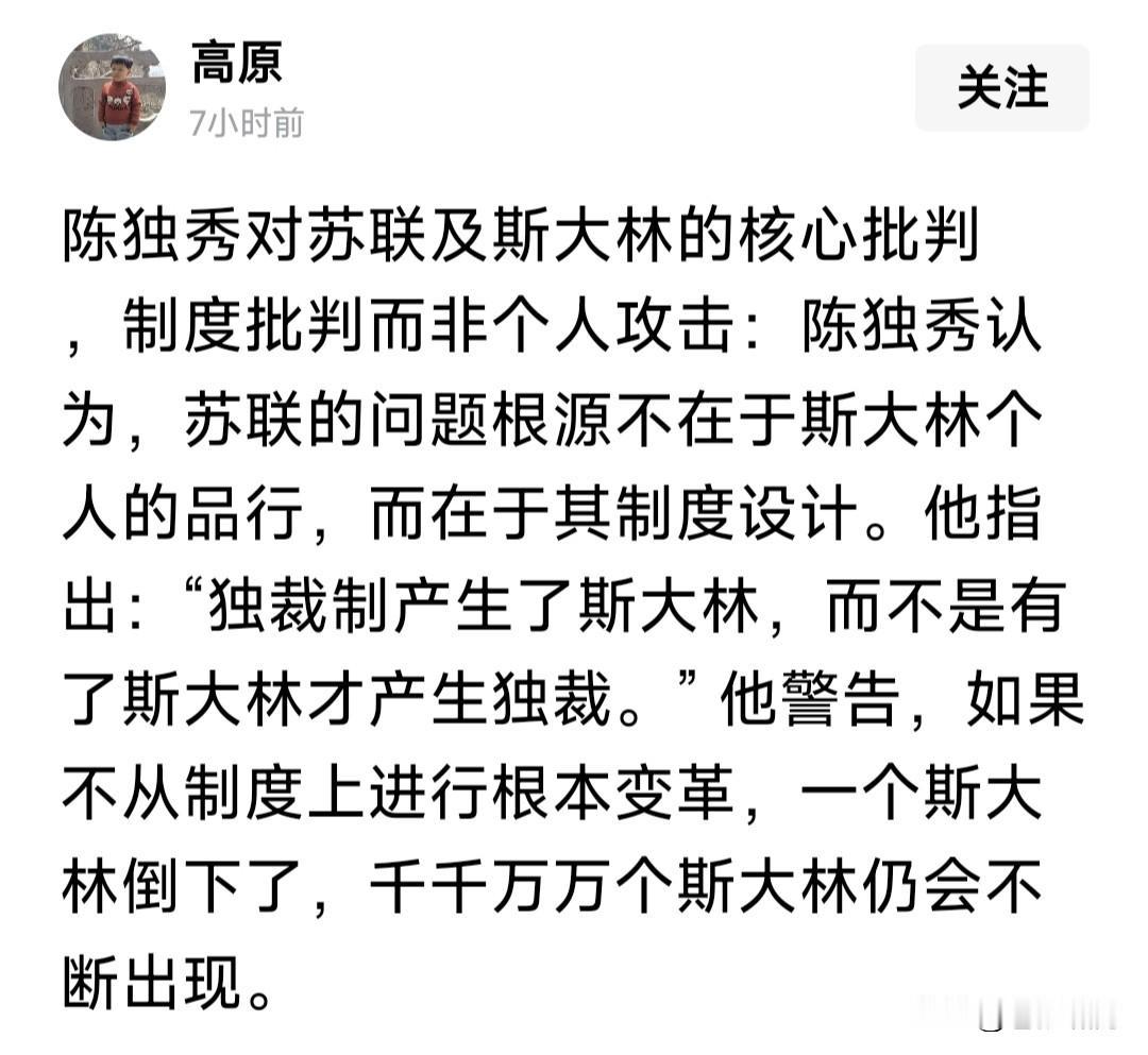 网友介绍陈独秀,对苏联体制的批判!令人十分震惊,有振聋发聩醍醐灌顶之感。不由使人对其更加敬仰! 比如他说:独裁产生斯大林,而不是斯大林创造独裁!如果制度不变,一个斯大林倒下,还会出现千万个! 比如他说:没有民主的无产阶级专政,只会导致官僚专制!没有民主就没有社会主义。政治上的民主主义,与经济上的社会主义,是相辅相成的。 他反对将民主视为资产阶级的专利!无产阶级民主的具体内容,应当与资产阶级民主一样,包括言论自由! 本人不知陈独秀先生,还有如此超拔高远言论,但他这些言论应该是后期,早期他的言论,尚无如此认知? 陈独秀以上言论,让人想到五四新文化运动!陈独秀与李大钊鲁村胡适等思想文化先驱,将永载中华史册! 陈独秀的言论,让人想到小平的论述:市场经济不是资本主义专利!经济改革须与政治体制改革同时进行!不管黑猫白猫,捉住老鼠就是好猫!实践是检验真理的标准!发展才是硬道理! …………
