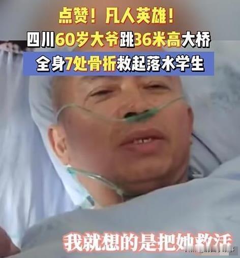 眼泪止不住了!四川,为救落水女子,60岁大爷从36米高的桥上跳下!不料,女子成功获救后,大爷身上的伤却让朋友哽咽了!朋友说:他是拼了命去救一个年轻生……网友点赞:这才是应该拿高额养老金的人! 这事就发生在四川内江西林大桥,36.3米的高度,实打实12层楼那么高,换个年轻人站在边上都腿软,60岁的熊冰大爷晨跑路过,听见呼救声,连犹豫都没有。 他随手把手机往地上一扔,翻身就翻过桥栏杆,朋友伸手去拉都没拉住,那一秒,他心里压根没想着自己的安危,满脑子都是把人救上来。 高空跳水的冲击力有多吓人?入水那一刻,大爷的身体像撞上了硬物,骨头都跟着震疼,可他咬着牙硬撑,奋力游了十几米才够到落水女子。岸上扔的救生圈够不着人,他就用胳膊死死箍住对方,一点点往岸边拖,每动一下,伤口都钻心地疼,愣是没松过半分力。 人是平安救上来了,大爷却直接瘫在地上起不来。送进医院一查,全身7处骨折,肺部还有多处挫伤,朋友守在病床边,看着他浑身是伤的样子,当场就哽咽得说不出话,一遍遍念叨:他是真把自己的命豁出去了。 有人问大爷后不后悔,他躺在病床上就一句朴实的话:“不为啥,就为了救人。”没有豪言壮语,却比任何说辞都戳心。 网友们说他该拿高额养老金,这话真不是偏心。60岁本该是遛弯享福的年纪,他却选择在生死关头挺身而出,这份善良和担当,比什么都珍贵。 现在总有人爱给群体贴标签,可熊大爷用最朴素的行动告诉我们,真正的英雄从不是天生的,是危难时刻愿意为陌生人拼命的普通人。 各位读者你们怎么看?欢迎在评论区讨论。