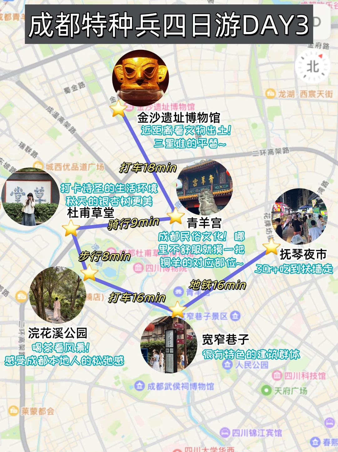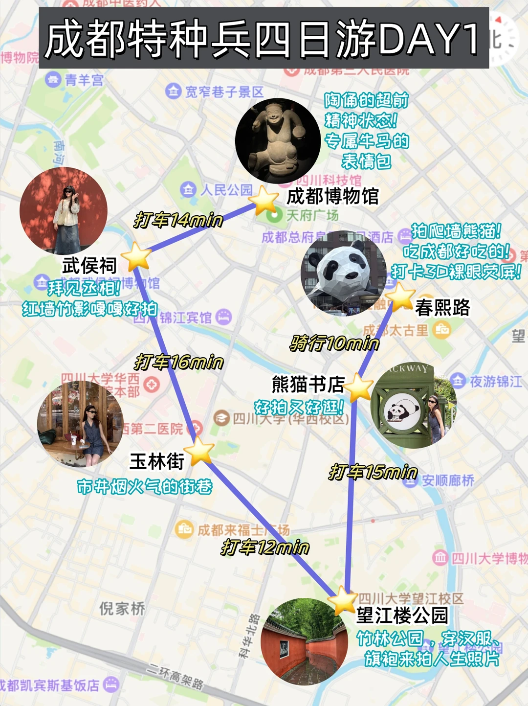 ⭕热门景点:大熊猫基地、三星堆博物馆、成都博物馆、文殊院、武侯祠、都江堰、青城山、熊猫谷、春熙路、人民公园等