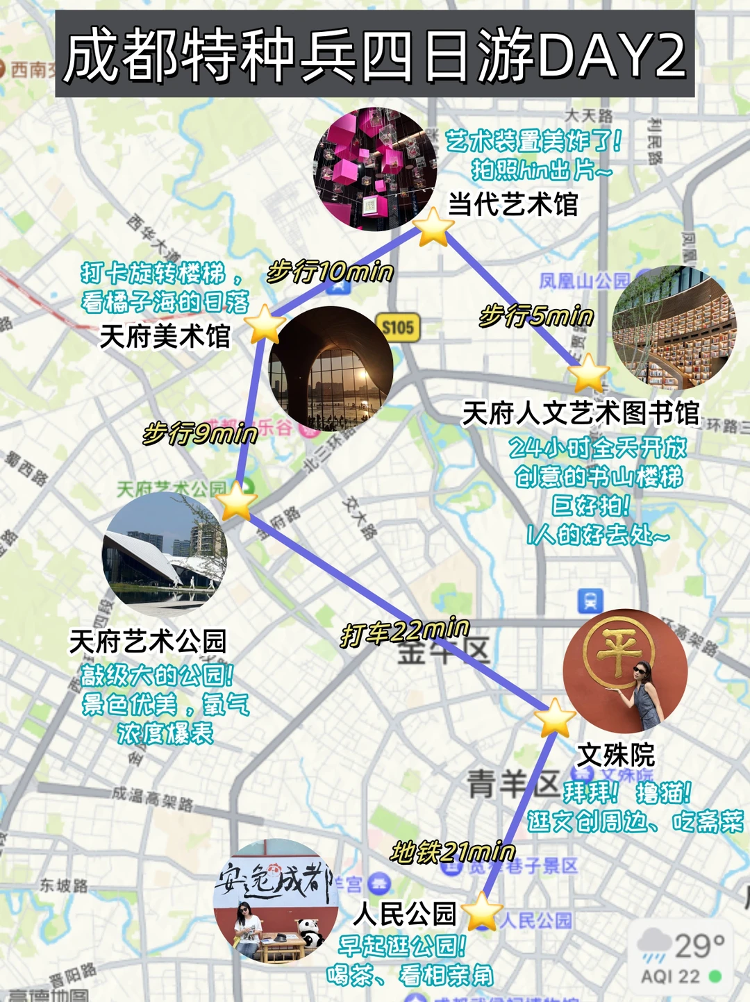📸拍照打卡:东郊记忆、太古里、SKP、双子塔、EVA红桥、魔方大楼、童话屋、天府公园、天府美术馆、望江楼公园等