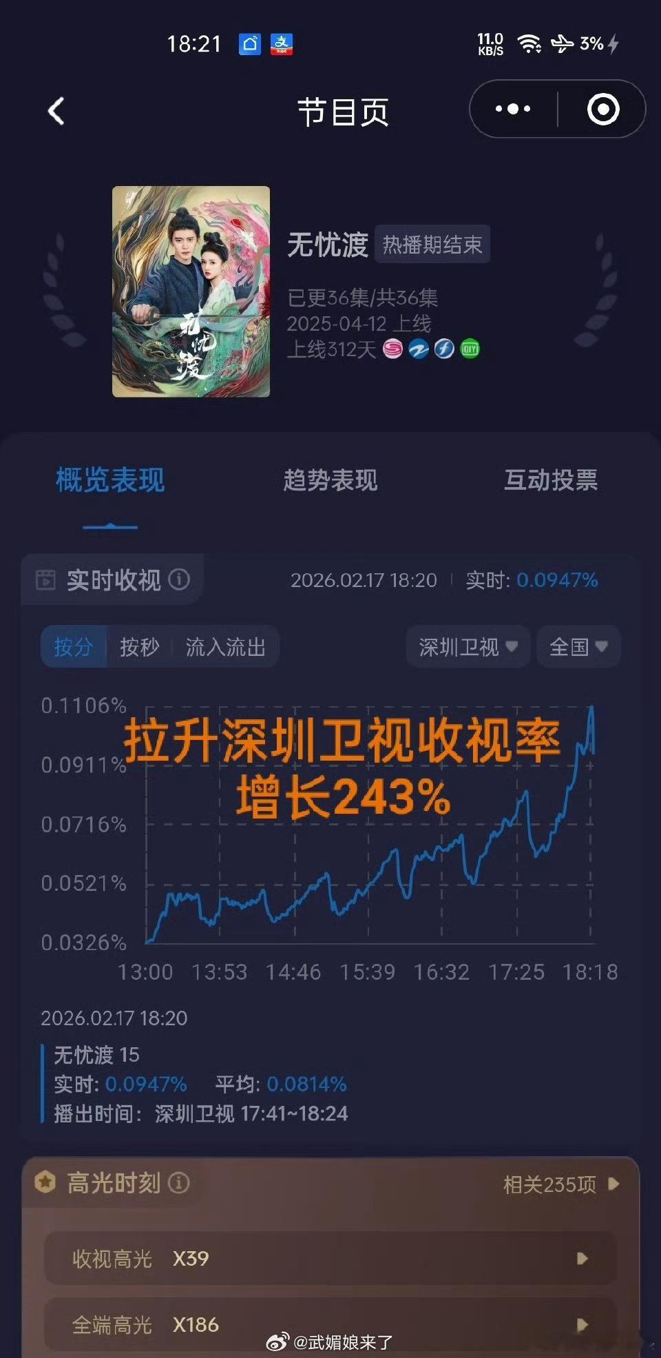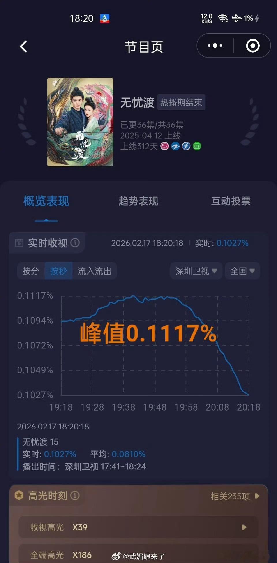 任嘉伦《无忧渡》深圳卫视重播第三天,收视直接起飞!酷云从开播0.0326%冲到峰值0.1117%,直接暴涨243%,是之前的3.4倍!明天起继续7集连播,追更久宣夜,越看越好看