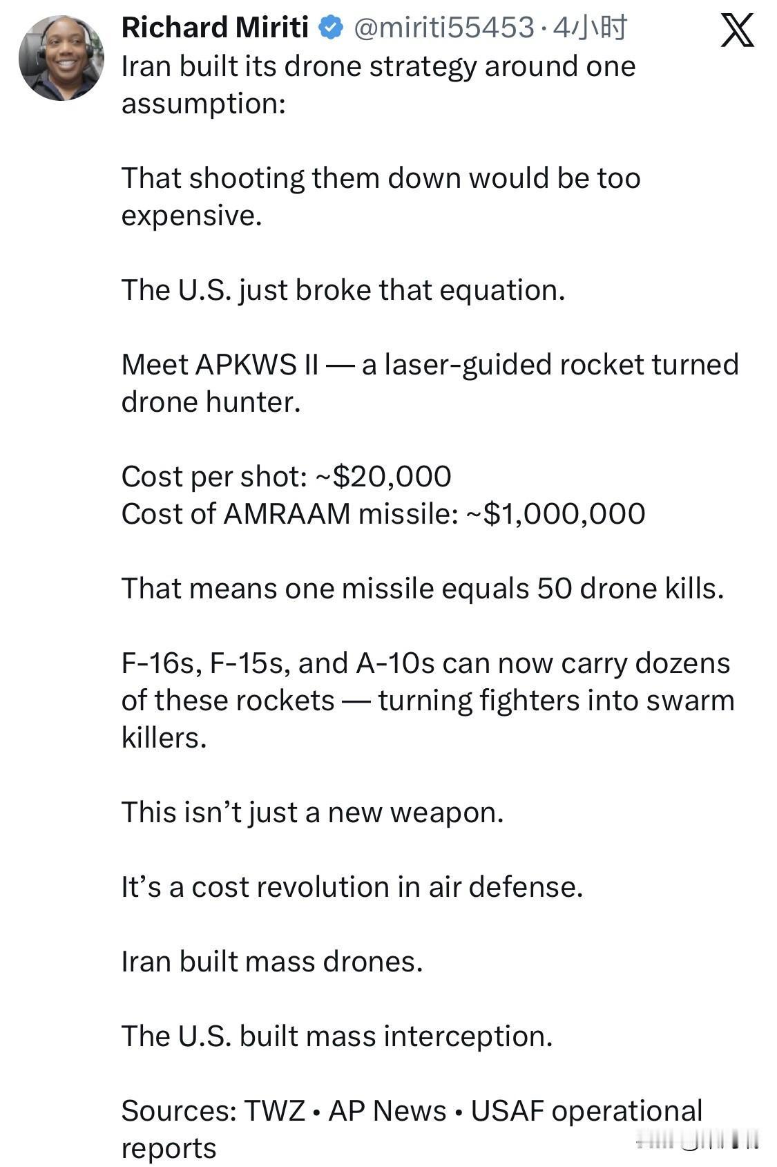美国空军(USAF)利用 APKWS II(改进型精确杀伤武器系统 II) 激光制导火箭弹,通过极高的性价比和载弹量,打破了伊朗依赖廉价无人机消耗对手昂贵防空导弹的战略。 核心优势:防空领域的成本革命 长期以来,使用价值 100 万美元 的 AIM-120 AMRAAM 导弹去拦截仅价值几万美元的自杀式无人机在经济上是不可持续的。APKWS II 的出现解决了这一“数学难题”: 极低成本: 单枚火箭弹的制导段成本约为 1.5 万至 2.5 万美元,加上火箭发动机和弹头后的总价也仅约 3 万至 3.5 万美元。 打击效能: 根据图片数据,单枚 AMRAAM 导弹的价格足以购买 50 枚 APKWS 火箭弹,实现了“1 比 50”的成本转换。 海量载弹量(弹药基数): 战斗机原本挂载 1 枚空对空导弹的挂架,现在可以挂载一个 7 联装 的火箭发射巢。一架 F-16 战斗机通过挂载多个发射巢,可携带数十枚此类火箭弹,极大地提升了应对“无人机群”饱和攻击的能力。 技术细节与作战表现 技术原理: APKWS II 并非全新的武器,而是通过在现有的大量 70mm 海德拉(Hydra 70) 无极制导火箭弹中间加入一个制导段,将其转化为精确制导武器。 打击方式: 它利用激光指引目标,并配备有 近炸引信,无需直接撞击即可在无人机附近爆炸并将其摧毁。 实战证明: 该系统已在红海等地区由 F-16、F-15E 和 A-10 等战机挂载,成功拦截了胡塞武装(受伊朗支持)发射的无人机和巡航导弹。