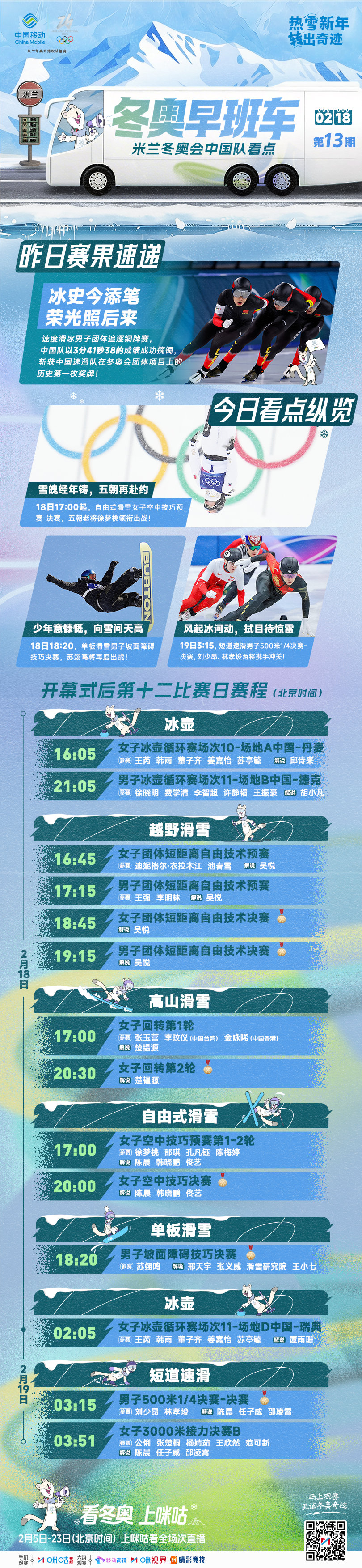 🚌冬奥早班车2月18日第13期⛸️速度滑冰队获冬奥历史首枚奖牌⏰17:00徐梦桃亮相冬奥赛场⏰18:20苏翊鸣冲击男子坡障决赛#看冬奥上咪咕##热雪新年翊起转#网页链接