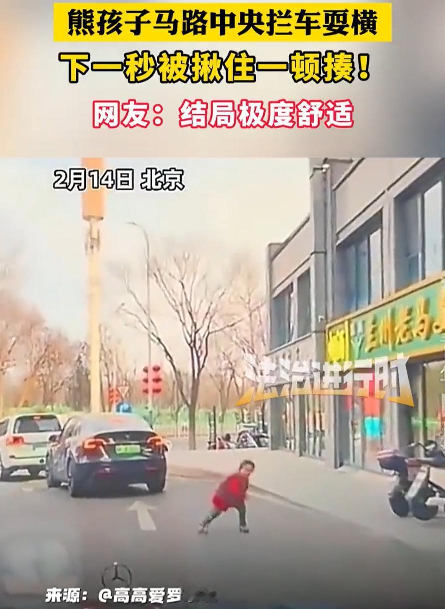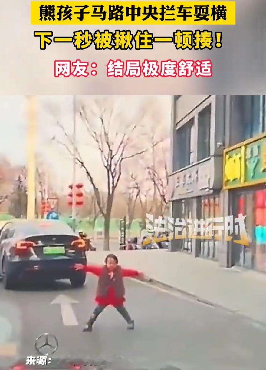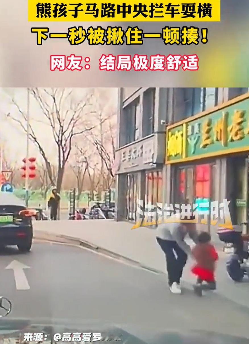 这一看就是亲爹!北京,男子在路上开车,突然一名小女孩调皮,跑到马路中央拦车耍横,吓得男子不敢轻举妄动,只能停车等候,结果下一秒女孩的父亲跑过来,一把将女孩拎起就是一顿揍,女孩也是瞬间就老实了。网友:车主前一秒还在抱怨,下一秒就该心疼了 行车记录仪显示,当时红衣服小女孩敞开着双臂走到路中央,跑到马路中间张开双臂,晃晃悠悠地拦着一辆私家车。那架势,活脱脱一个小路霸,就是单纯地想皮这么一下。开车的大哥也是好脾气,没按喇叭也没骂街,直接把车停下,看这小祖宗到底想干啥 几秒钟后,女孩的父亲突然跑过来,一把将女儿揪起来,然后对着她的屁股就打了两下,看得出是真教训,但也是真有效果,小女孩当场就老实了 这事传到网上,评论区一片叫好。有网友表示:这位父亲做得对,孩子犯了错,当打则打,不然等以后出了事就全晚了 也有网友表示:看到这样的结果司机不会生气,甚至还会劝劝别打孩子,可如果家长上来也不管不问,司机的火气一下就顶满了 说实话,这位父亲动手,打的不是孩子,打的是路上那些看不见的危险。马路不是游乐场,汽车不是玩具,这次是遇上脾气好的司机,万一遇上个刹不住的,或者分神的,后果想都不敢想。当父母的,有时候宁愿让孩子疼一下长记性,也不愿将来因为自己的心软,让孩子吃更大的亏 有时候,能被父母这样教训,也是一种福气。至少说明有人在管你,有人在你做错事的第一时间冲出来纠正你。比起那些犯了错都没人理的,这顿揍,挨得值