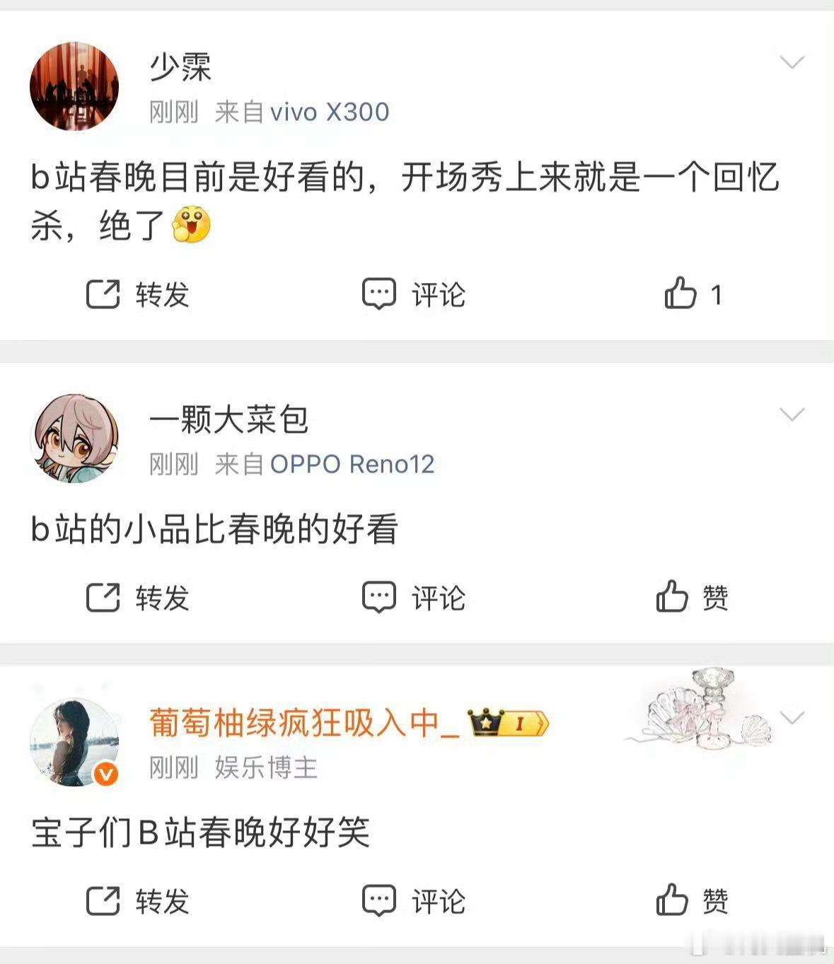 B站春晚口碑只能说没有条条框框的限制,B站还是更懂年轻人,恰好年轻人喜欢玩互联网,所以大家能看到一个接着一个热搜,而春晚更迎合长辈那一代人。