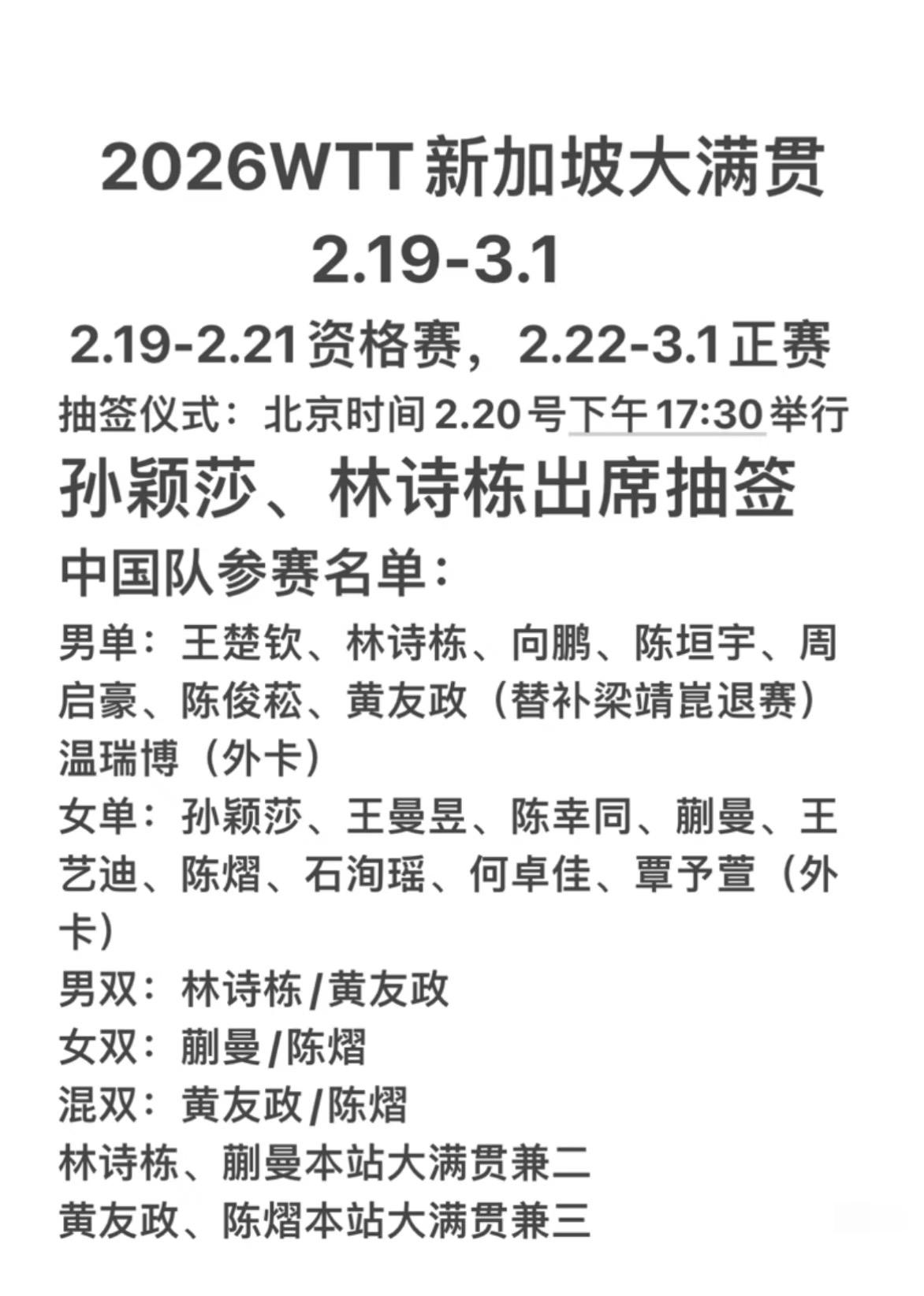 勒布伦兄弟大年初二已经到达新加坡——新加坡大满贯2月19日至3月1日即将开赛! 勒布伦兄弟也来的太早了, 好像有什么拍摄任务, 兄弟俩都穿着比赛服, 估计也是去拍宣传照了, 他们提前到场也是为了倒时差吧! 新加坡大满贯2000分的冠军积分, 是2026年开年的第一次 大赛,各国选手都对这场比赛 跃跃欲试,2000积分的 冠军争夺战一触即发! 国乒也将在明年, 大年初三出征新加坡, 孙颖莎和林诗栋参加抽签仪式, 祝国乒队员都能顺利抽到好签, 加油国乒!
