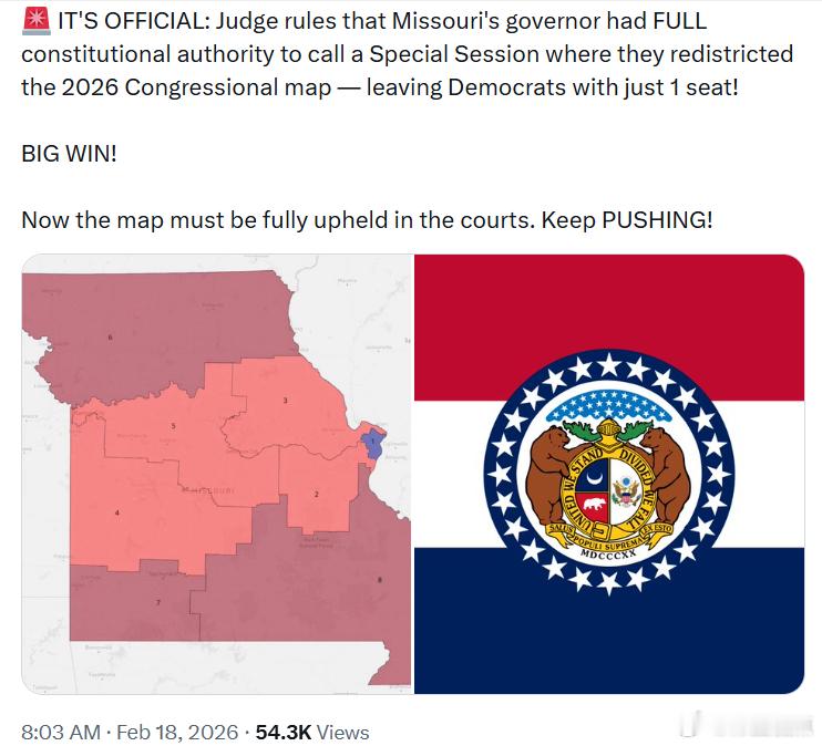 法官裁定,密苏里州州长拥有完全的宪法权力召集特别会议,并在该会议上重新划分了2026年的国会选区——使民左党只剩下1个席位!