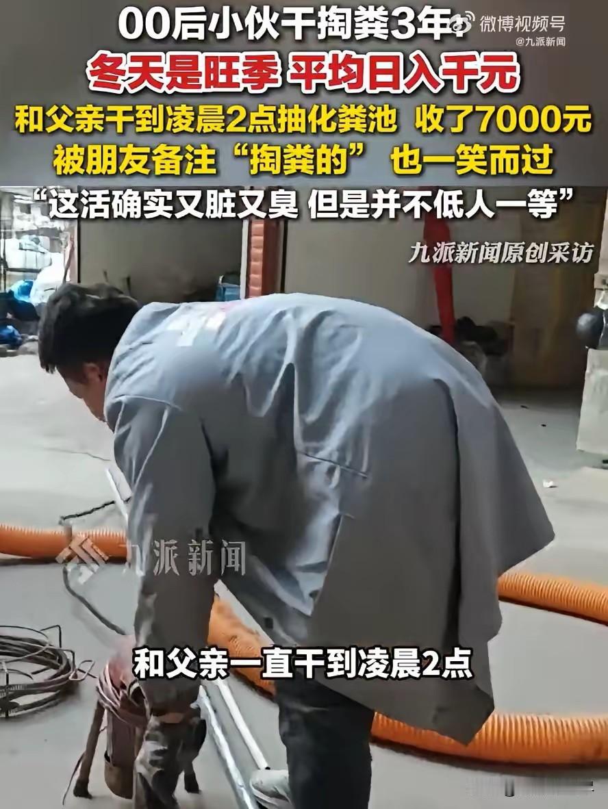 真香警告!江西赣州,一名00后小伙干了3年掏粪工,不少朋友得知后,甚至直接给他备注掏粪的。可小伙毫不在意,因为他平均日收入千元,有时候一天甚至有7000。网友:还招人吗?我不在意别人备注“掏粪的” 说起又脏又累的工作,很多人第一反应就是收入不高,可江西赣州这名00后小伙,偏偏用亲身经历打破了大家的固有印象,他坚守在化粪池清理、管道疏通的岗位上三年,顶着旁人的异样眼光,却靠着踏实肯干拿到了远超普通上班族的收入,也让不少网友直呼真香。 这名2000年出生的小伙,三年前在家人的带领下接触到化粪池清理与管道疏通工作,刚入行时他也有过抵触心理, 毕竟这份工作常年和污物打交道,环境差、气味重,还容易被身边人误解,可真正上手之后,他才发现这份看似不体面的工作,有着实实在在的回报。 三年时间里,小伙一直扎根在当地及周边乡镇提供服务,冬季和春节前是行业旺季,家家户户都要清理管道与化粪池,订单多到忙不过来, 他经常从早上八点一直忙碌到晚上十点,中途只能简单吃口饭补充体力,长期的高强度作业让他积累了熟练的操作经验,也练就了不怕苦不怕脏的心态。 工作过程中,粪水溅到身上、脸上是常有的事,遇到堵塞严重的化粪池,还要手动打碎板结污物,全程都要忍受刺鼻的气味,即便如此,他也没有产生过放弃的念头,始终认真对待每一笔订单。 身边的朋友得知他的工作内容后,态度各不相同,有人表示不理解,还有人直接在通讯录里给他备注上带有职业标签的称呼, 面对这些玩笑或是偏见,小伙从来没有放在心上,也没有因为职业属性觉得低人一等,他清楚这份工作靠力气和技术吃饭,每一分收入都来得光明正大。 日常接单的收入十分可观,旺季期间平均每日收入能达到一千元,遇到紧急订单时收入更高, 曾经有一次接到紧急清理需求,他和家人从下午四五点一直忙碌到凌晨两点,连续作业近十个小时,清运多车污物,这一单的收入就达到七千元,这样的收入水平,远超他之前做过的各类零工。 为了更好地承接业务,小伙购置了专业的清理车辆与设备,每月要承担车辆车贷、保险、油费、养护等固定开支,即便扣除各项成本,到手的收入依旧十分可观,靠着这份工作,他实现了稳定的经济收入,也为自己和家人创造了更好的生活条件。 他的工作状态完全是24小时待命,只要有客户求助,无论白天黑夜、天气好坏,都会第一时间上门处理,用专业的服务赢得了不少回头客,订单量也一直保持稳定。 随着小伙的经历被更多人知晓,迅速引发了网友的关注与讨论,大家纷纷感慨职业不分高低贵贱,靠双手赚钱最光荣,还有不少网友主动询问招聘信息,表示不在意他人看法,愿意尝试这份工作。 小伙用三年的坚守证明,没有不起眼的工作,只有不努力的人,哪怕身处平凡又辛苦的岗位,只要踏实肯干,同样能收获丰厚的回报,也能赢得他人的尊重。 对此,你们有什么看法,欢迎评论留言~
