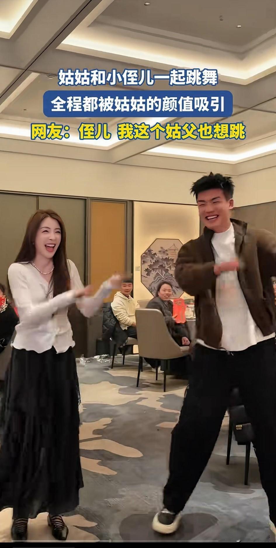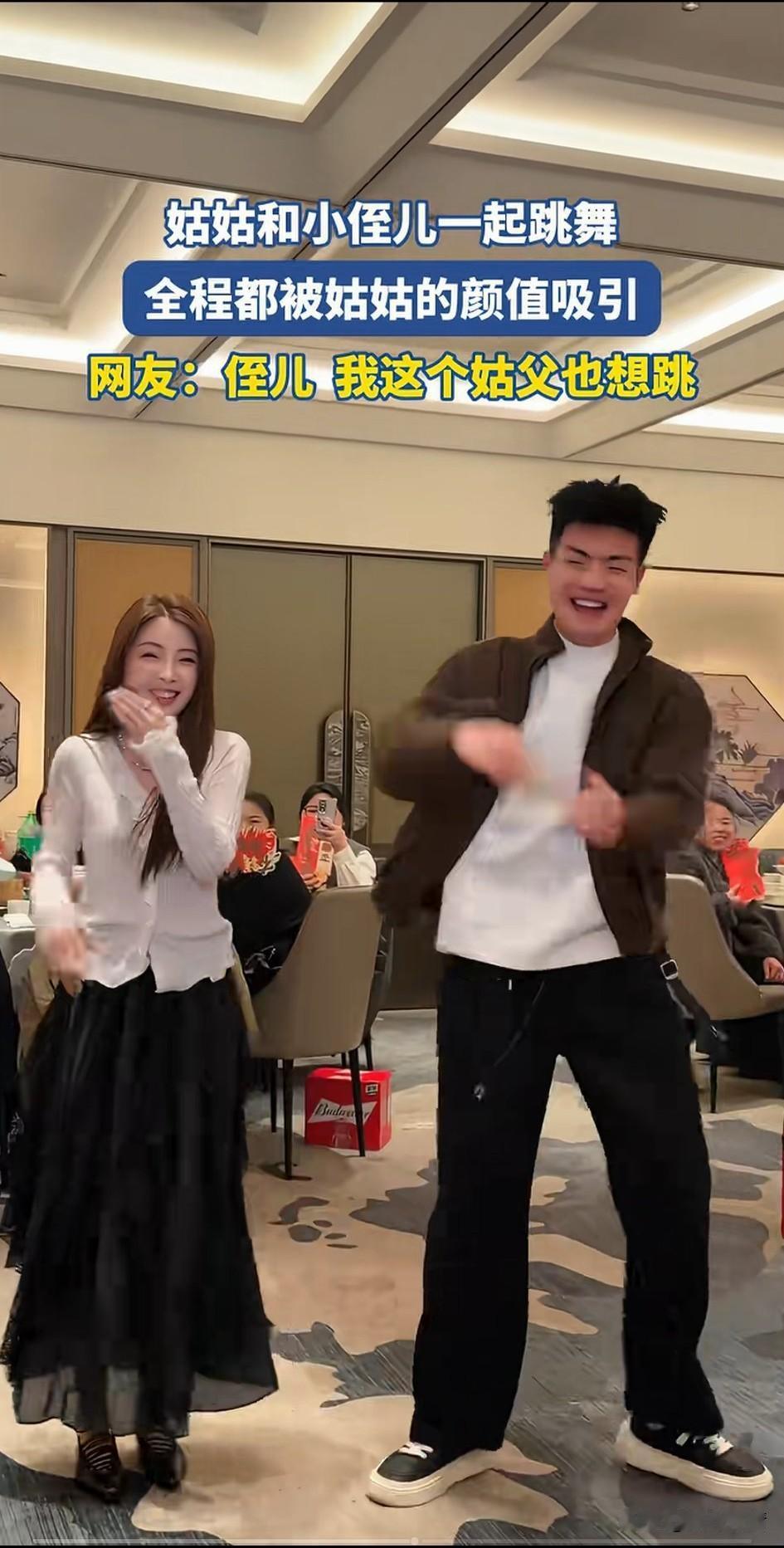 过年了一家人团聚, 他们租了一个包间吃饭, 结果姑姑非要展示才艺, 旁边的侄子也跟着过去跳舞, 亲戚们都看的乐开了怀, 两个人的舞蹈让姑父有些嫉妒了, 毕竟那可是他媳妇儿, 他也想去跳舞助助兴, 可惜自己不会, 这视频一放到网络, 大家表示都被姑姑吸引了, 没想到还有这么漂亮的姑姑, 不过他的侄子也挺帅气的, 只不过这姑姑有点儿过于年轻, 大家觉得这两个人像姑姑和侄子吗? 跟姑姑的情感 看望侄子 姑侄子合照 姑父家长辈小聚