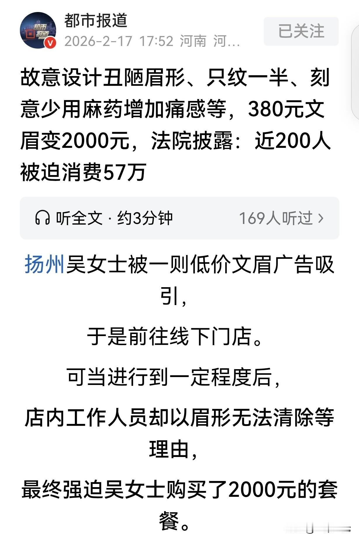 “为了挣钱没底线!”江苏扬州,一女子看到一广告,“380元精品纹眉,预付18元定金”,女子心动了,可眉形出来后,女子差点没被丑吐了,她说啥都不纹了,店家却说定框的眉形洗不掉了,还说这样出门太难看,最终,女子只能被迫买了2000元高价套餐。女子越想越不对劲,直接报了警,这才发现,她不是第一个受害者,这家店用这手段,迫使近200名消费者上当,挣了57万昧心钱。结局太爽了。 俗话说:爱美之心,人皆有之!吴女士也不例外。 平常,她总想着让自己变得更漂亮些,尤其对自己的眉毛不太满意,一直琢磨着找个机会,去纹个好看的眉形。 2024年4月的一天,吴女士像往常一样刷着手机,突然一条网络广告映入眼帘:“380元精品纹眉,预付18元定金”。 这价格太诱人了,吴女士瞬间动了心。她心想,这么便宜就能拥有精品文眉,简直太划算了,期待着能通过这次文眉,让自己变漂亮。 很快,吴女士按照广告上的地址,来到了纹眉店。 到店后,她爽快地付了款,等着纹眉师给自己打造出满意的眉毛。 然而,当纹眉操作进行到一定程度,纹眉师给她展示“380元效果图”时,吴女士差点没被丑吐了。 那眉形歪歪扭扭,颜色深浅不一,完全不是她想象中的样子。吴女士当即表示不愿继续,要求停止纹眉。 可这时,工作人员却说已经定框的眉形去不掉,还阴阳怪气地说:“你这样出门太难看了,别人都会笑话你。” 话音刚落,店长也闻讯赶来,和工作人员一起,围着吴女士你一言我一语地游说起来。 他们一会儿说有个2000的套餐效果有多好,一会儿又说现在停止文眉,前面花的钱就白费了。 吴女士心里又气又急,她想走,可又担心顶着这丑眉毛出去被人笑话。 继续纹吧,又实在不想花这冤枉钱。就在她犹豫不决的时候,纹眉师时不时地提醒她,如果不选高价套餐,后续的修复会更麻烦。 在店长的威逼、工作人员的利诱以及自己内心的恐惧和尴尬下,吴女士最终无奈地选择了2000元的高价套餐。 回到家后,吴女士越想越不对劲,她意识到自己被骗了,于是果断报了警。 后来她才知道,自己不是第一个受害者,这家店长期通过虚假广告引流,用各种手段迫使近200名消费者“被升单”,赚了57万昧心钱。 好在法律不会放过这些坏人,最终店长和相关人员受到了应有的惩罚,这也给那些想靠不正当手段赚钱的人敲响了警钟。 有人说,美容院套路,除了这个,他们还经常用免费骗你去店里,到了那里拼命给你推销,脸做到一半把你放在那里,不买会员就不让走也不给你继续做。 这家纹眉店打着低价精品文眉的幌子,吸引消费者上钩,等顾客发现效果不佳想放弃时,便用各种话术和手段威逼利诱,迫使顾客购买高价套餐。 这种行为不仅违背了基本的商业道德,更是对消费者权益的严重侵害。 生活中,类似的美容院套路并不少见,像免费体验变强制推销、脸做到一半被“绑架”消费等情况屡见不鲜。 这些不良商家为了挣钱毫无底线,利用消费者爱美又贪图便宜的心理,设下一个个陷阱。 消费者往往在不知不觉中就陷入了他们的圈套,遭受经济损失的同时,还可能面临身体和心理上的伤害。 在面对各种诱人的广告和促销活动时,我们一定要保持清醒的头脑,不要被低价冲昏了理智。 《刑法》第226条规定,以暴力、威胁手段,强买强卖商品的,或者强迫他人提供或者接受服务的,情节严重的,处三年以下有期徒刑或者拘役,并处或者单处罚金。 此案例中,纹眉店店长及相关人员通过言语威胁、心理强制等手段,迫使吴女士等近200名消费者接受高价文眉服务,强迫交易金额累计达57万余元,情节严重,符合强迫交易罪的构成要件。 最终,法院以强迫交易罪判处陈某有期徒刑1年4个月,并处罚金20000元;对王某等3人判处缓刑,并处相应罚金。 对于这件事,你怎么看? 欢迎关注@一案一论