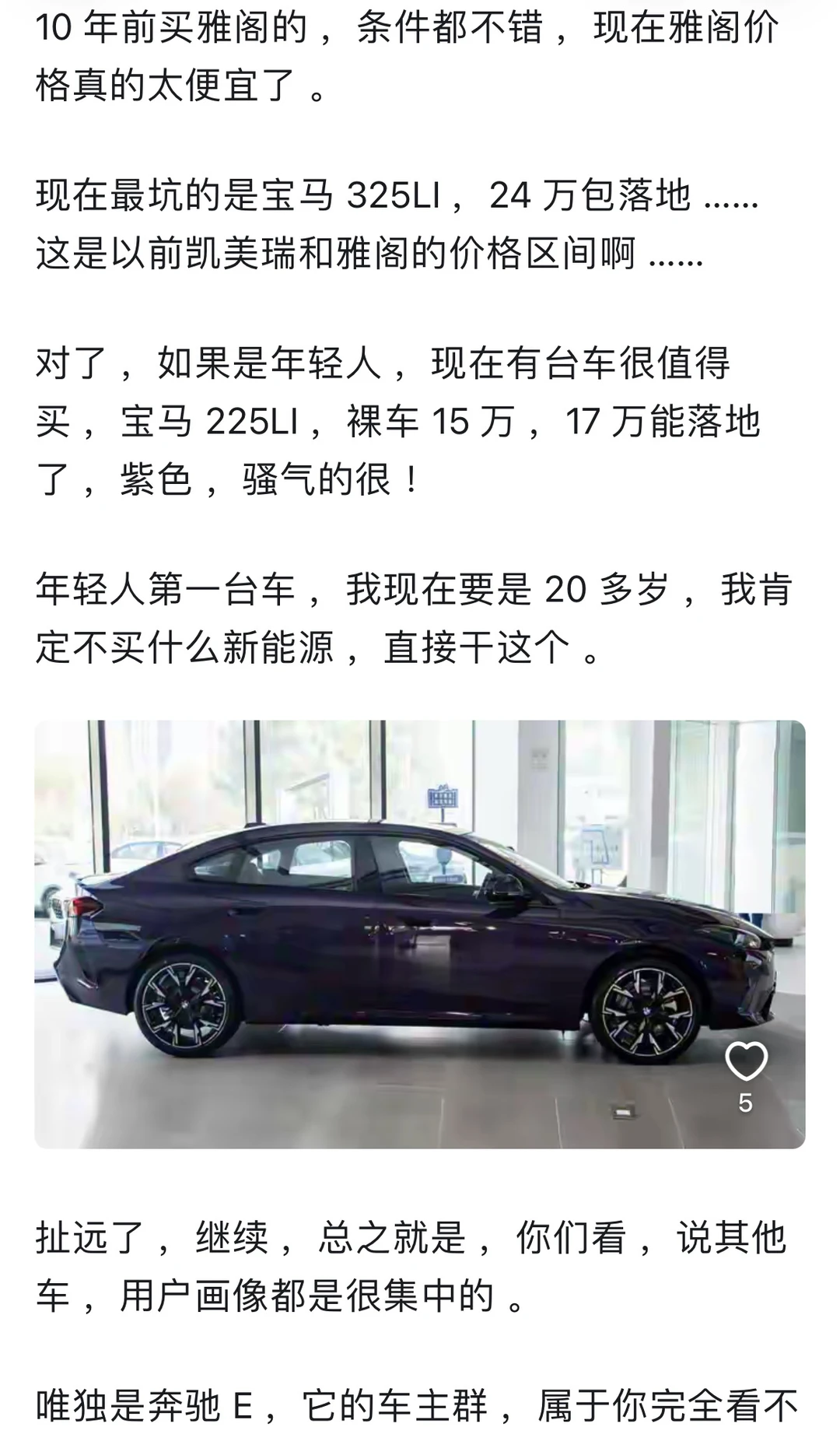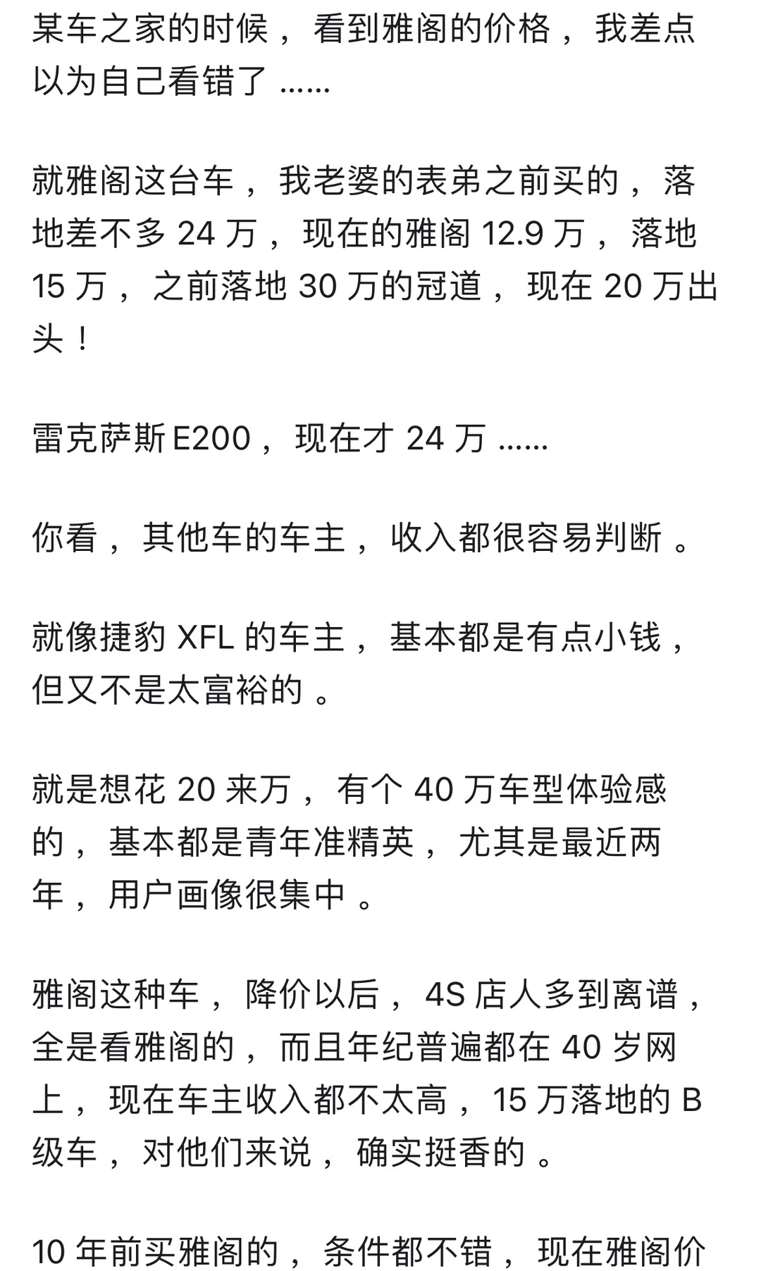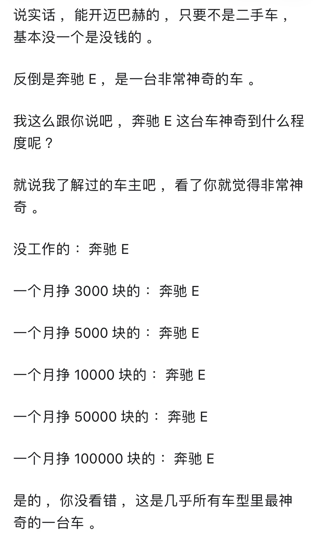 🚗从车可以落了解一个人吗? 答案是大概率可以的。 房车作为我们现代人钦点的2大件。 基本上可以中来判断一个人的 ⏰25-55岁人群 开10w以下的车,99%属于普罗大众 开10-25w以下的车,99%属于小康家庭 开50w以上的车,99%属于富裕阶层 开100w以上的车,已经超越99%的地球人 🌍在国内,最难通过车价衡量身价 反而是25-50w这个层次 毕竟受教育多年,务必牢记谦虚谨慎,艰苦奋斗这个道理还是深入人心的。 很多掌握社会资源的,反而更注重“低调” 但是再低调,有点身份的也接受不了10w上下的车 🐎人靠衣装马靠鞍 像网上所谓的广东人再低调,也没几个有钱人真开吉利奇瑞(没有说它不好的意思) 最起码也是丰田、雷克萨斯 ⏰25-50这个区间,属于某些人咬咬牙也能够得上的天花板,也属于某些人士能接受的地板 车和房作为国内钦点的两大件 还是有原因的 当你年收入过30w,夫妻家庭年收入过60w,非农家庭出身,你几乎不可能考虑低于30w的车。 你看某些人说年收入过50,但是开个10来万车的,也确实有 但是这些人的共同画像是:农村家庭出身,家庭负担重。 ❤️当然,你说我月如3千开的迈巴赫,也不是没有可能,以上讨论仅仅指符合正态分布的3sigma原则。