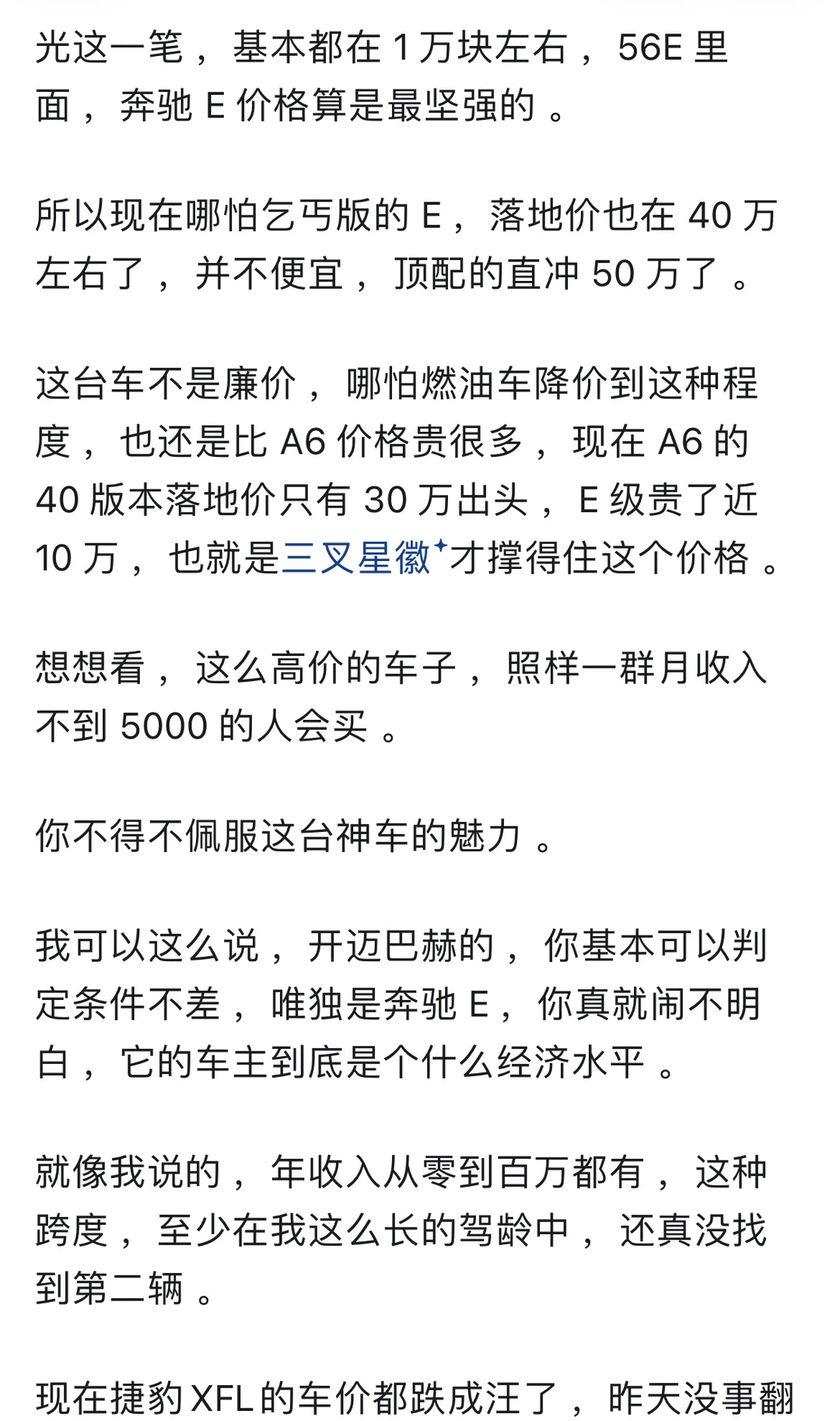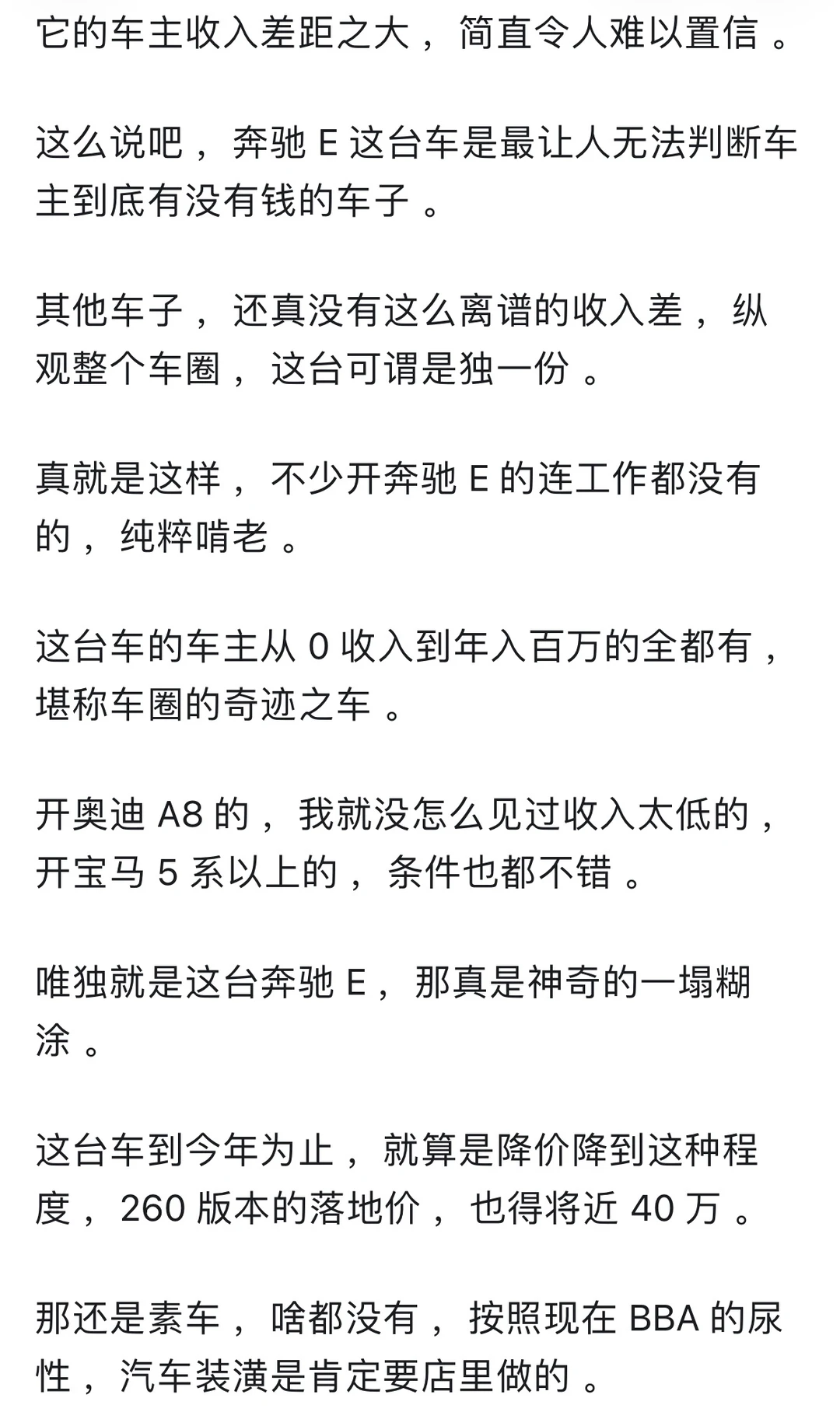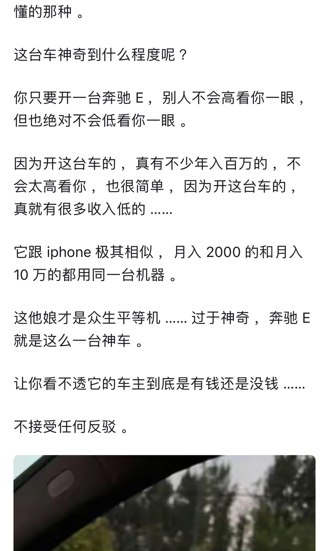 🚗从车可以落了解一个人吗? 答案是大概率可以的。 房车作为我们现代人钦点的2大件。 基本上可以中来判断一个人的 ⏰25-55岁人群 开10w以下的车,99%属于普罗大众 开10-25w以下的车,99%属于小康家庭 开50w以上的车,99%属于富裕阶层 开100w以上的车,已经超越99%的地球人 🌍在国内,最难通过车价衡量身价 反而是25-50w这个层次 毕竟受教育多年,务必牢记谦虚谨慎,艰苦奋斗这个道理还是深入人心的。 很多掌握社会资源的,反而更注重“低调” 但是再低调,有点身份的也接受不了10w上下的车 🐎人靠衣装马靠鞍 像网上所谓的广东人再低调,也没几个有钱人真开吉利奇瑞(没有说它不好的意思) 最起码也是丰田、雷克萨斯 ⏰25-50这个区间,属于某些人咬咬牙也能够得上的天花板,也属于某些人士能接受的地板 车和房作为国内钦点的两大件 还是有原因的 当你年收入过30w,夫妻家庭年收入过60w,非农家庭出身,你几乎不可能考虑低于30w的车。 你看某些人说年收入过50,但是开个10来万车的,也确实有 但是这些人的共同画像是:农村家庭出身,家庭负担重。 ❤️当然,你说我月如3千开的迈巴赫,也不是没有可能,以上讨论仅仅指符合正态分布的3sigma原则。
