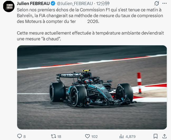 据法国记者、评论员Julien FEBREAU:F1委员会当地时间今天上午在巴林召开,FIA决定从今年8月1日更改引擎压缩比测量方法。