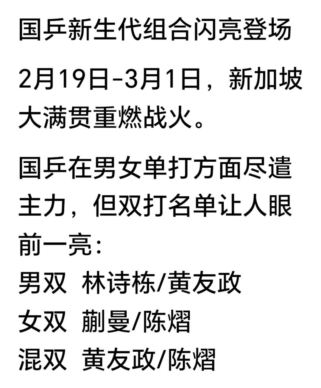 乒乓球比赛预告 乒乓爱好者,请留意明天(2月19日)开赛的新加坡大满贯赛!因为,这几年中国乒团受到海外乒团的冲击和挑战,比赛起来越来越不容易,要有大心脏、要有拼搏心态才能战胜对手的搏杀心态。 今年的新加坡赛场比往年更有火药味,外协高手几乎倾巢而出,日本张本智和、法国勒布伦兄弟、巴西雨果这些老对手早就把国乒当成头号目标,训练里专门针对性研究打法,就等着在正赛里放手一搏。国乒这次派出17人全主力阵容,孙颖莎冲击三连冠,王楚钦向万分先生里程碑迈进,年轻队员黄友政、温瑞博从资格赛就开始拼,每一场都没有退路。 网友们聊得最多的就是现在的乒乓球早就没有稳赢的说法,以前看国乒比赛总觉得冠军十拿九稳,现在每一局都要捏着汗看完。外协选手进步速度太快,发球接发环节越来越刁钻,相持球敢拼敢变,遇到国乒反而放下包袱全力搏杀,稍微松懈就可能被爆冷。 赛场边上的教练组比队员还紧张,这次特意拆散老牌双打组合,让年轻选手身兼单打双打混双三项,就是用高强度比赛磨心态练抗压。很多球迷心疼队员连春节都在备战,从大年初二就奔赴赛场,背后的训练量和心理压力,远不是镜头前那几分钟能展现出来的。 大家也在讨论真正的强大不是永远不输,而是被冲击之后还能稳住节奏咬下关键分。这届大满贯不只是抢积分夺冠军,更是为2028奥运周期摸底练兵,年轻选手能不能顶上来,老将能不能扛住压力,都会在新加坡赛场给出答案。 多哈乒乓球赛程 乒乓球赛程安排 乒乓球赛大满贯 国乒赛事安排 乒乓球赛程时间 国乒乓球赛事 乒乓赛程 乒乓赛事 比赛从明天资格赛就开打,正赛阶段央视体育频道全程直播,过年宅家正好能看一场场顶级对抗。你最期待哪位队员的表现,觉得这次国乒能拿下几项冠军?