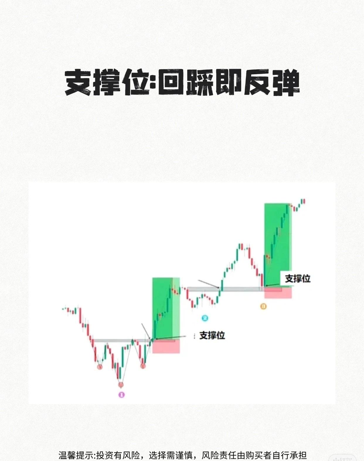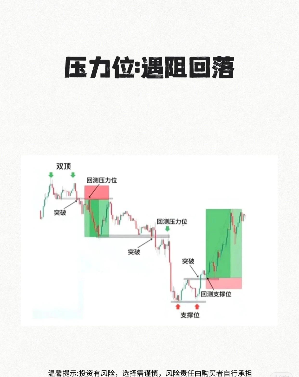 股票技术分析里的支撑位和压力位,以及如何快速识别和运用它们。 1. 基本概念与识别速度 - 第一张图强调:可在约10秒内找出支撑位和压力位。 - “支撑位”“压力位”用粉色背景突出,便于记忆。 2. 压力位的特点与应用(第二张图) - 标题:压力位——遇阻回落。 - 股价遇到前期高点形成的压力位时,容易受阻回落。 - 突破压力位后会回测确认,若无法站稳则再度回落;站稳则可能转为支撑。 3. 支撑位的特点与应用(第三张图) - 标题:支撑位——回踩即反弹。 - 股价下跌到前期低点形成的支撑位时,常出现反弹。 - 图中两次触及支撑位后均展开上涨通道。 - 配合箭头标记反弹起点、高点及后续走势。 4. 支撑位与压力位的相互转换(第四张图) - 标题:支撑位和压力位的互换。 - 原本的支撑位被跌破后,可能转化为新的压力位。 - 图中展示双顶形态与颈线突破后进入看跌行情的过程。 5. 压力位的层级区分(第五张图) - 标题:大压力位和小压力位。 - 压力位可分为重要压力区(上方粉色区域)和次级压力位(下方灰色区域)。 - 不同级别的压力位影响力度不同。 总结要点: - 支撑位:股价下跌到关键位置时容易止跌反弹。 - 压力位:股价上涨到关键位置时容易遇阻回落。 - 两者可随行情突破或跌破发生角色互换。 - 识别支撑/压力位有助于判断买卖时机,但需注意投资风险。