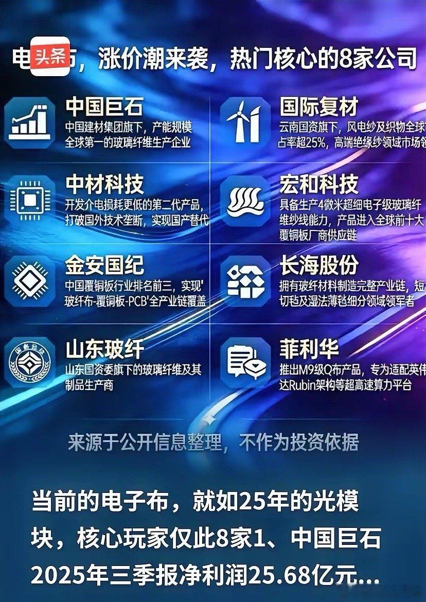 突发!电子布淡季暴涨10%🔥中国巨石躺赢涨价潮,单轮提价狂赚4.4亿,2026业绩超预期?光模块神话还没落幕,电子布直接开启疯涨模式!2026开年淡季不淡,7628电子布单米猛涨0.5-0.6元,涨幅超10%,涨价斜率直接翻倍!AI算力底层骨架彻底供不应求,龙头躺赚时刻来了,中国巨石就是最大赢家,数据全给你扒透👇🔥电子布涨价炸穿天花板,供需缺口彻底堵死- 涨价力度超预期:2026年2月龙头集体提价,单月涨幅是之前的2-3倍,高端Low-CTE电子布单价80-240元/米,是普通布的3-5倍,毛利率直冲60%+- 供给卡死无新增:织布机交付周期18个月+,认证周期长达1-2年,有钱也扩不了产,2026全年供需缺口持续放大- 下游疯抢:台耀CCL因缺布停产,英伟达/英特尔供应链紧急备货,订单排到下半年,量价齐升确定性拉满🚀中国巨石:涨价总龙头,每涨0.5元狂赚4.4亿!1️⃣全球产能霸主,量价齐升最受益电子布年产能9.6亿米,2026年销量11-11.5亿米全球第一,淮安5万吨电子纱投产,产能再增30%,行业涨价直接吃满红利2️⃣涨价业绩测算,弹性炸穿天际✅单米涨价0.5元,净利润直接增厚4.4亿元✅2025三季报净利25.68亿,同比+67.51%,电子布业务占比持续提升✅低介电高端布通过头部认证,单价比普通布高50%+,毛利率持续修复3️⃣全产业链兜底,安全边际拉满全球玻纤市占28%,成本控制行业无敌,深度绑定生益科技等头部客户,切入英伟达AI服务器供应链,国产替代+涨价双重驱动💡四大核心玩家,涨价受益排序1. 中国巨石:弹性第一,业绩增量4.4亿+2. 中材科技:高端突破,弹性2亿+3. 国际复材:风电+电子布双轮驱动,弹性1.9亿+4. 宏和科技:高端超薄龙头,弹性1亿+⚠️风险提示本人非专业投顾,以上仅为行业信息整理与个人思考,不构成任何投资建议。市场有风险,决策需独立判断、自负盈亏!