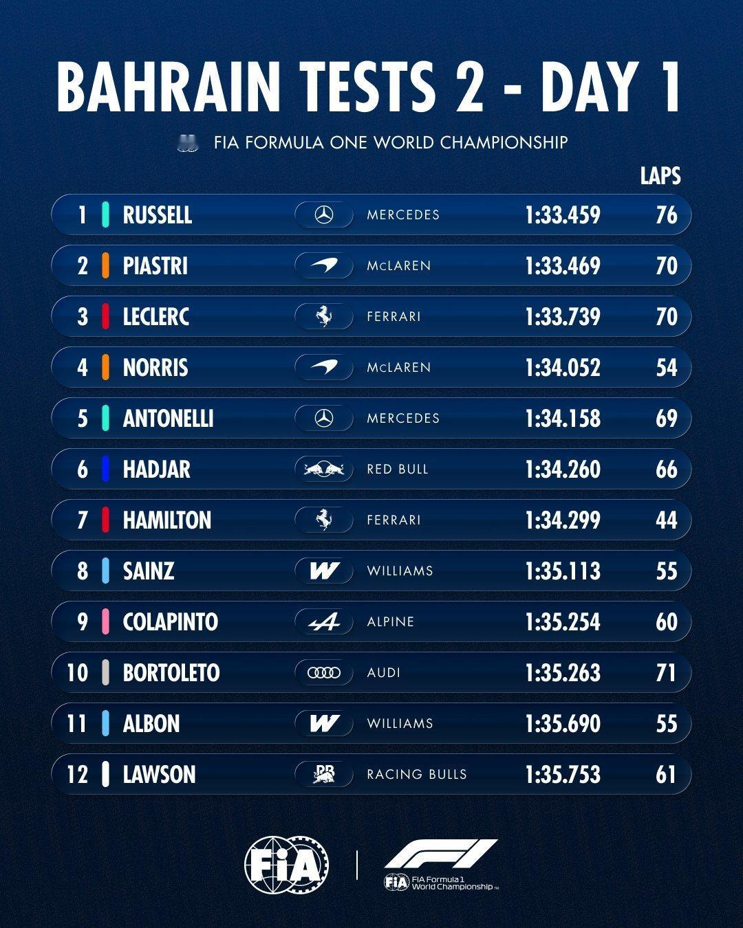 2026f1季前测试 巴林第二轮季前测试第一天结束,拉塞尔在最后阶段跑出1:33.459刷新了巴林测试最快单圈,皮亚斯特里落后0.01秒排名第二,勒克莱尔位列第三。