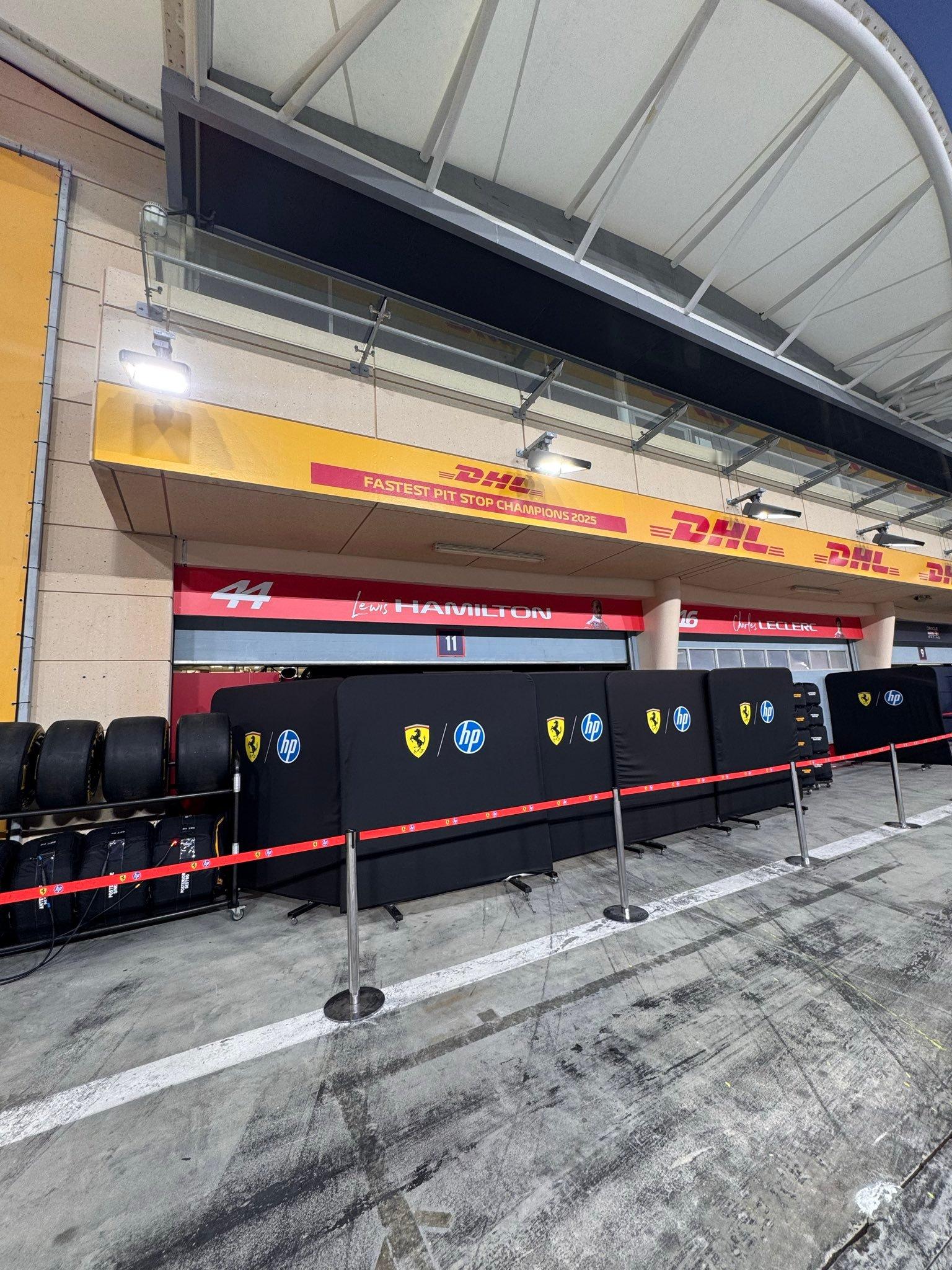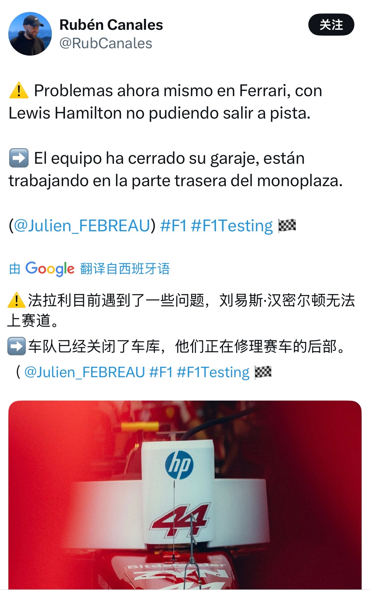 汉密尔顿赛车遇到了一些问题,车队正在修理赛车后部。法拉利P房大门紧闭。