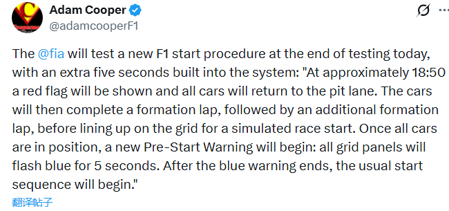 FIA将在今日测试结束之前评估新的发车程序,多给车手5秒时间: