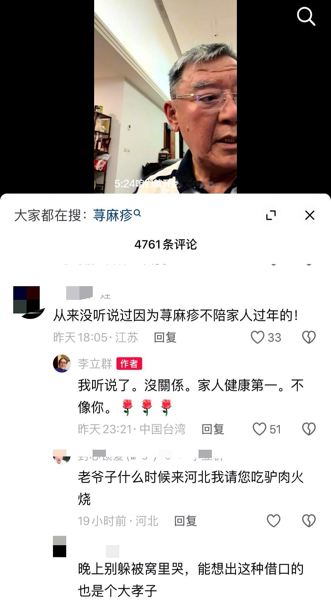 就因为个风疹块,过年都不回家? 饭桌上亲戚一句调侃,李立群端起酒杯,抿了一口,眼睛都没抬:“家人健康第一,不像你。” 其实老爷子心里也惦记,嘴里念叨好几次“都齐了,就老大没回”。儿子怕传染,硬是不肯来,他也没再强求。 一杯酒,一句话,护住了一个儿子,也堵住了一张嘴。