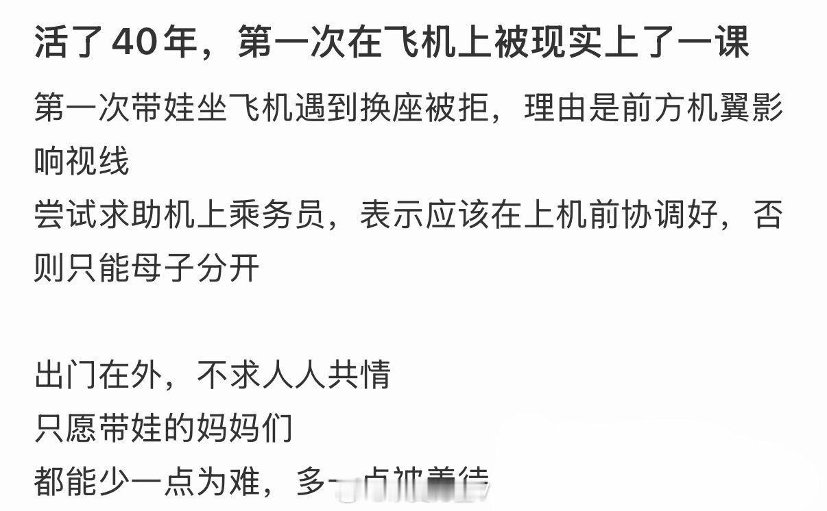 一个带娃妈妈在飞机上换座被拒,于是在社交平台发文——【活了40年,第一次在飞机上被现实上了一课】
