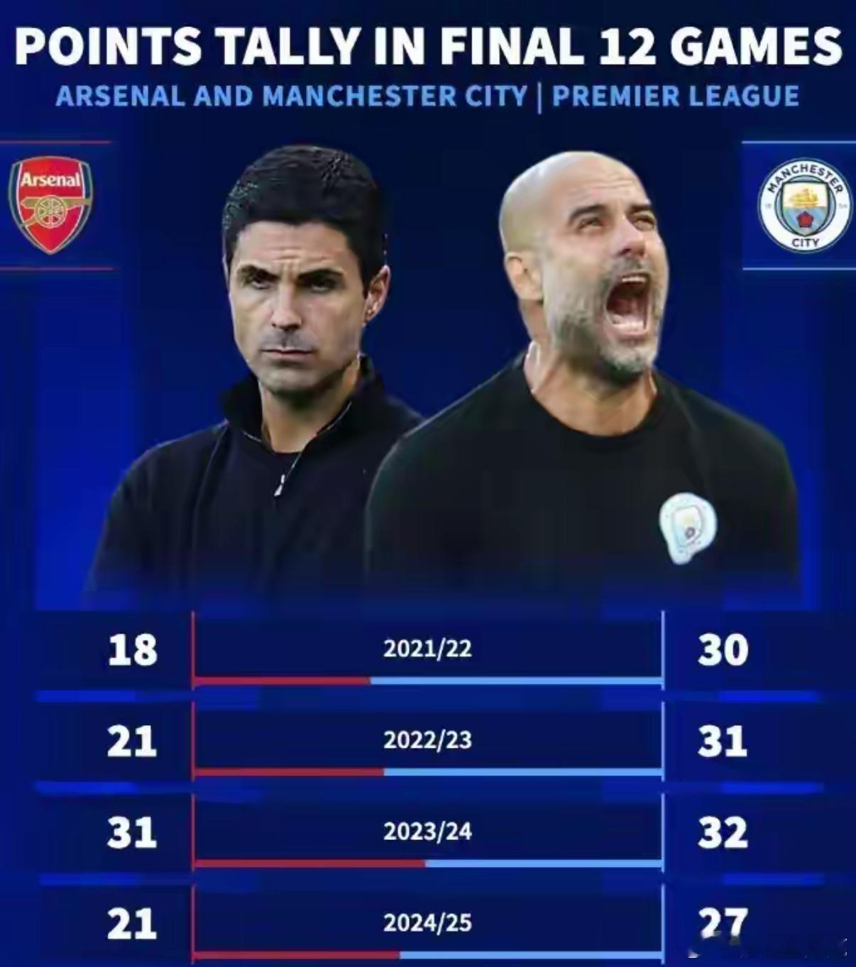 阿森纳和曼城在此前4个赛季英超最后12轮比赛中,阿森纳拿到的积分总是不如曼城:21-22赛季,阿森纳只拿到18分,而曼城拿到了30分;22-23赛季,阿森纳只拿到21分,而曼城又到了31分;23-24赛季,阿森纳拿到了31分,曼城拿到了32分;24-25赛季,阿森纳拿到了21分,而曼城拿到了27分。