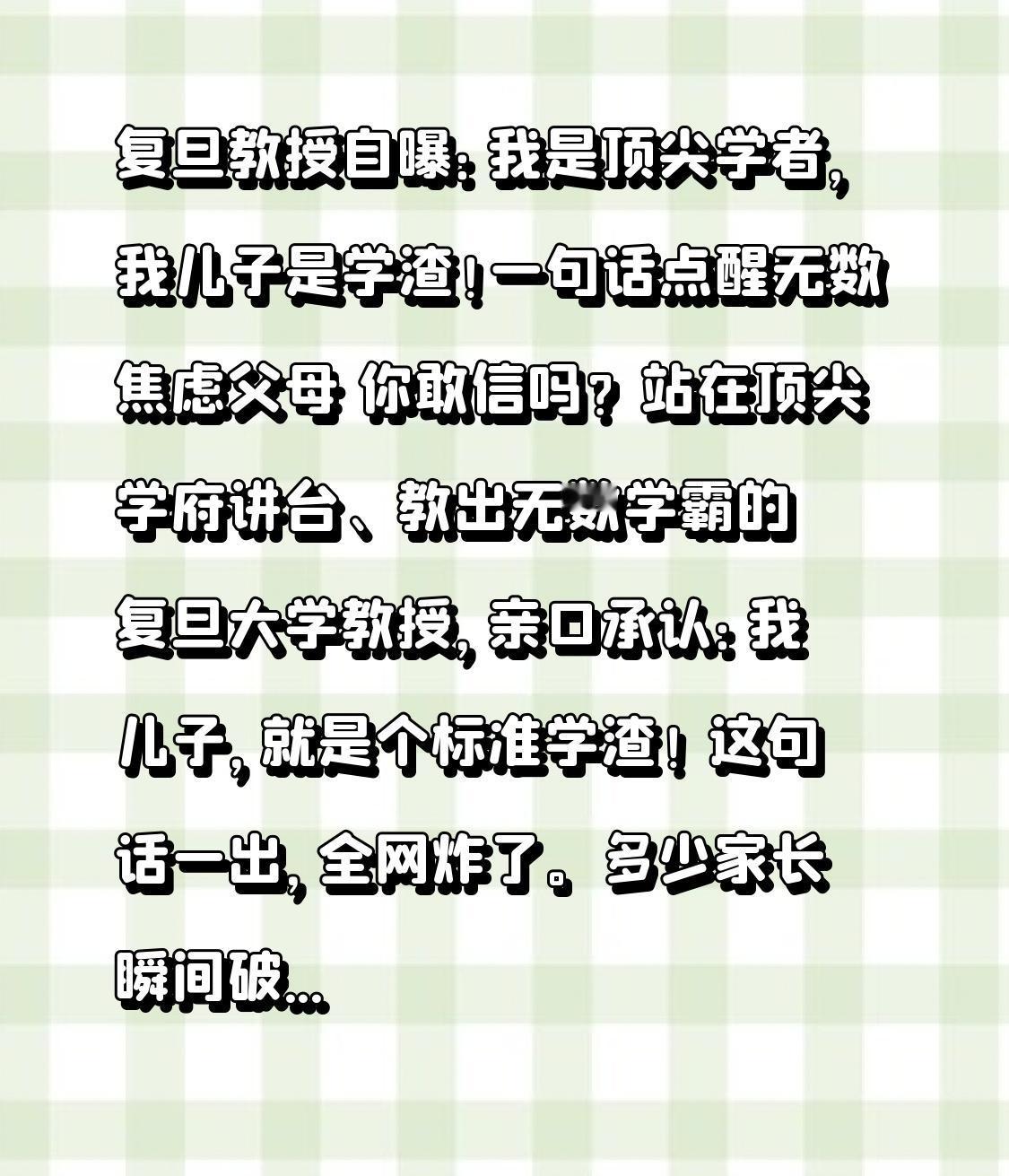 复旦教授自曝:我是顶尖学者,我儿子是学渣!一句话点醒无数焦虑父母 你敢信吗?站在顶尖学府讲台、教出无数学霸的复旦大学教授,亲口承认:我儿子,就是个标准学渣! 这句话一出,全网炸了。多少家长瞬间破防:我们天天鸡娃、报班、盯作业,恨不得把孩子逼成年级第一,连复旦教授都在为孩子成绩头疼,原来高知家庭,也逃不过养出普通孩子的宿命。 一开始,教授和所有家长一样,崩溃、焦虑、自我怀疑。 他能把复杂知识讲得通透,能带研究生做课题,能在学术圈站稳脚跟,可面对自家孩子的试卷,红叉一片、分数垫底,他也整夜睡不着。 他试过辅导、讲道理、定目标,能用的方法全用了,孩子就是不开窍,成绩依旧稳坐后排。 那段时间,他甚至问自己:我连别人的孩子都能教好,为什么偏偏教不会自己的儿子? 直到一次谈心,孩子低着头说:爸,我不想当学霸,我就想平平安安、自食其力,将来好好过日子。 那一刻,教授突然释然了。 他终于承认:孩子不是父母的复制品,不是用来完成你未竟梦想的工具。你是教授,不代表孩子必须是天才;你站在高处,不代表孩子必须一路登顶。 他慢慢发现,儿子虽然成绩不好,但心地善良、会照顾人、懂礼貌、心态阳光,同学喜欢他,老师也说他懂事。 他可能成不了精英,进不了名校,拿不了高薪,但他能做一个温暖、靠谱、不啃老、对社会无害的普通人。 这,难道不是一种成功吗? 反观我们身边,多少家庭被内卷绑架: 幼儿园拼双语,小学拼奥数,初中拼升学率,高中拼985。 孩子累到崩溃,家长急到失眠,亲子关系降到冰点,最后换来的,可能只是一张并不理想的成绩单。 我们总说不能输在起跑线,却忘了人生不是短跑,是漫长的马拉松。 不是每个孩子都适合走读书这条路,不是所有优秀都要用分数定义。 健康的身体、健全的人格、善良的本心、踏实的态度,这些比一张满分试卷,更能护佑孩子一生。 复旦教授的清醒,给所有家长上了一课: 接受孩子的平凡,才是父母最顶级的修行。 你望子成龙,可孩子可能只是一棵小草;你盼女成凤,可孩子也许只想做一只自在的小鸟。 小草有小草的坚韧,小鸟有小鸟的快乐,只要向阳生长,就值得被爱。 致所有正在鸡娃、焦虑、内耗的父母: 放过孩子,也放过自己。 不必人人成学霸,不必个个出人头地。 愿我们都能放下执念,接纳孩子的不完美,陪着他,慢慢走,好好活。 平凡的人生,同样值得骄傲。