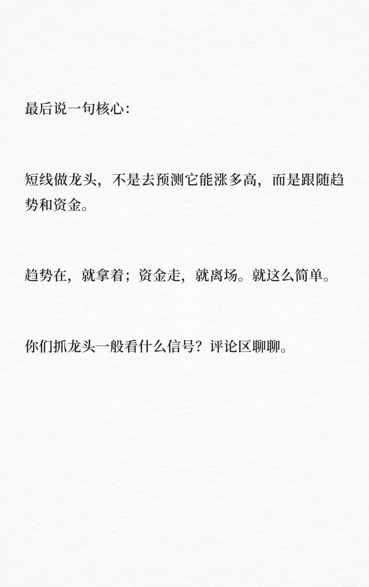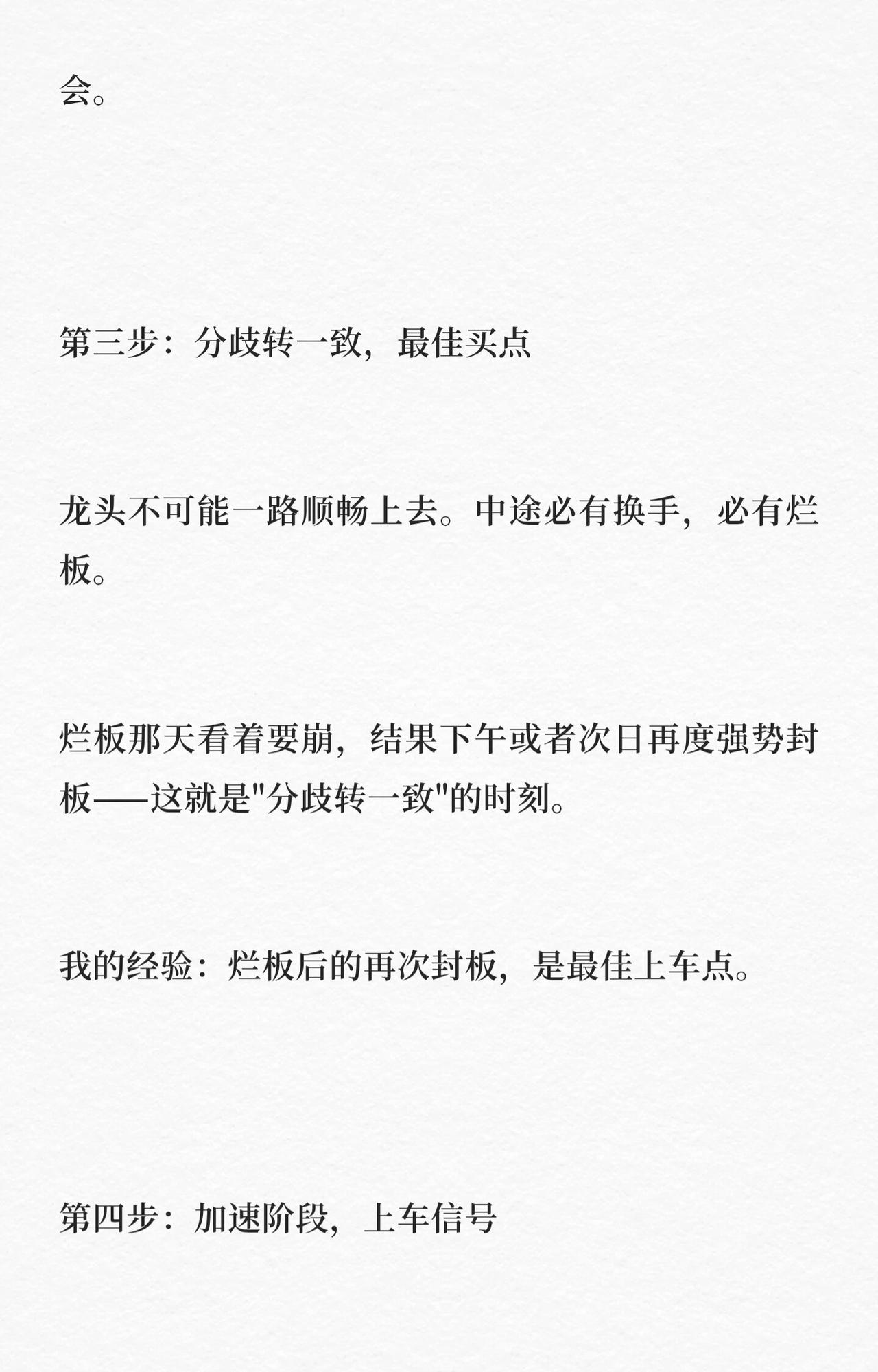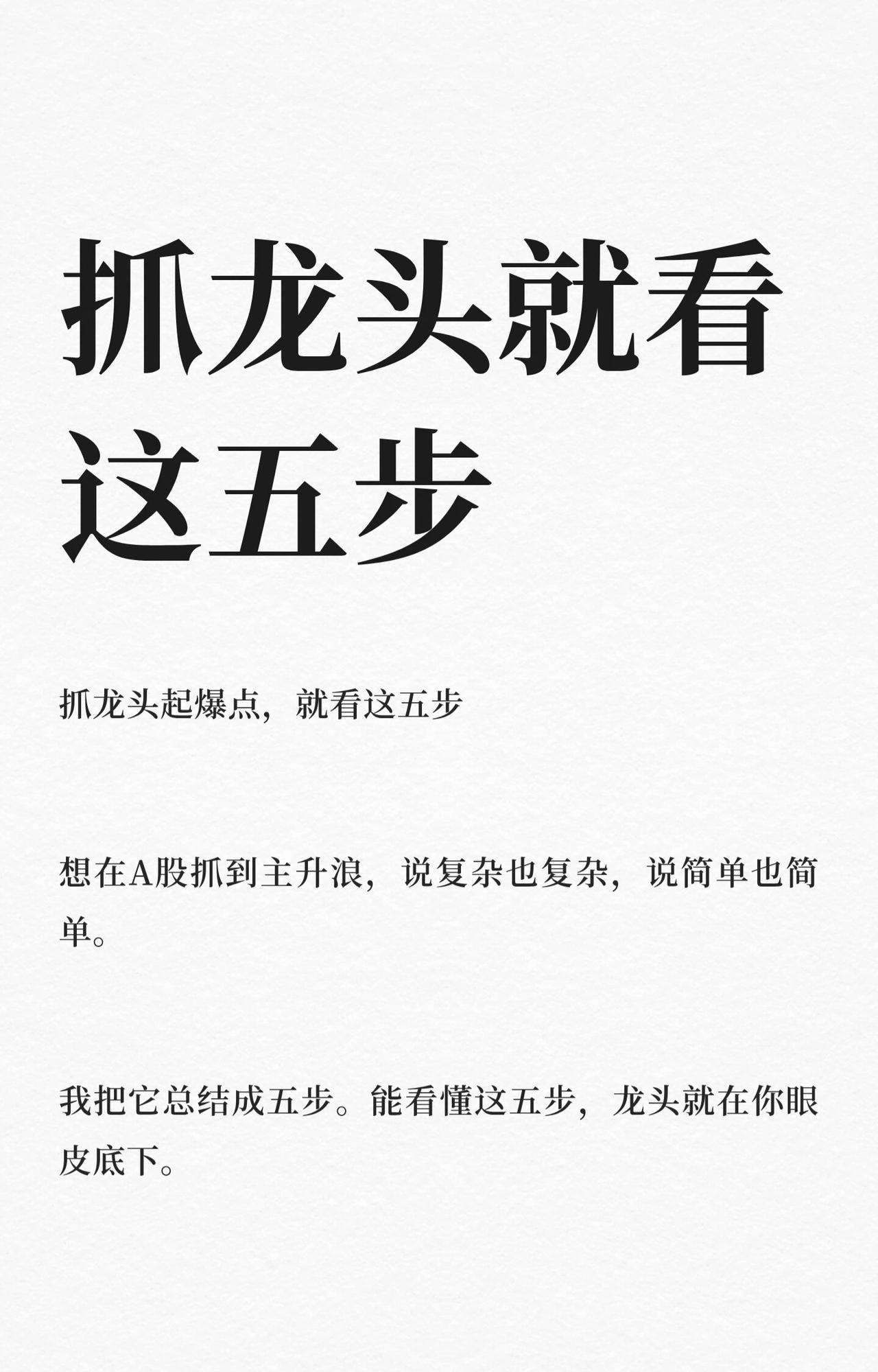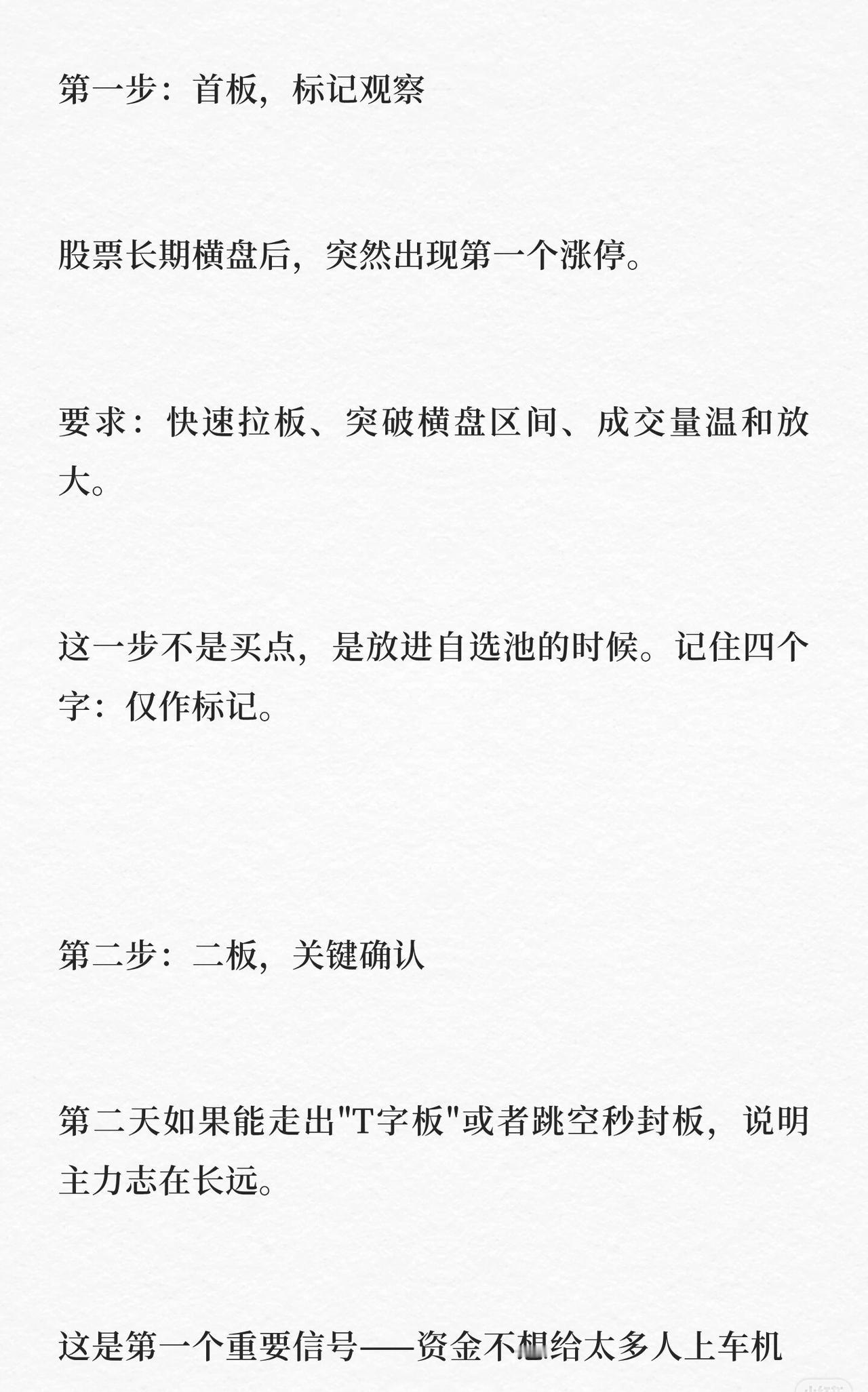 A股抓龙头五步法总结: 1. 首板标记:长期横盘后首板(快拉、破区间、量稳)进自选,不买。 2. 二板确认:次日T字/跳空秒封板,主力意图明确,可关注。 3. 分歧转一致:上涨中烂板后再次封板,为最佳买点。 4. 加速上车:跳空突破前高留缺口,低开回踩不补缺时跟进。 5. 高位止盈:高位一致转分歧(冲高回落、巨量换手、封不住板)果断离场。 核心:跟随趋势与资金,趋势在持,资金走撤。