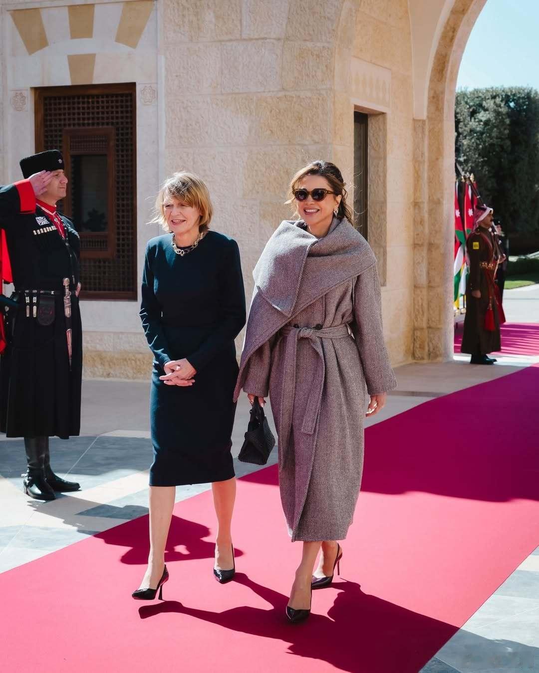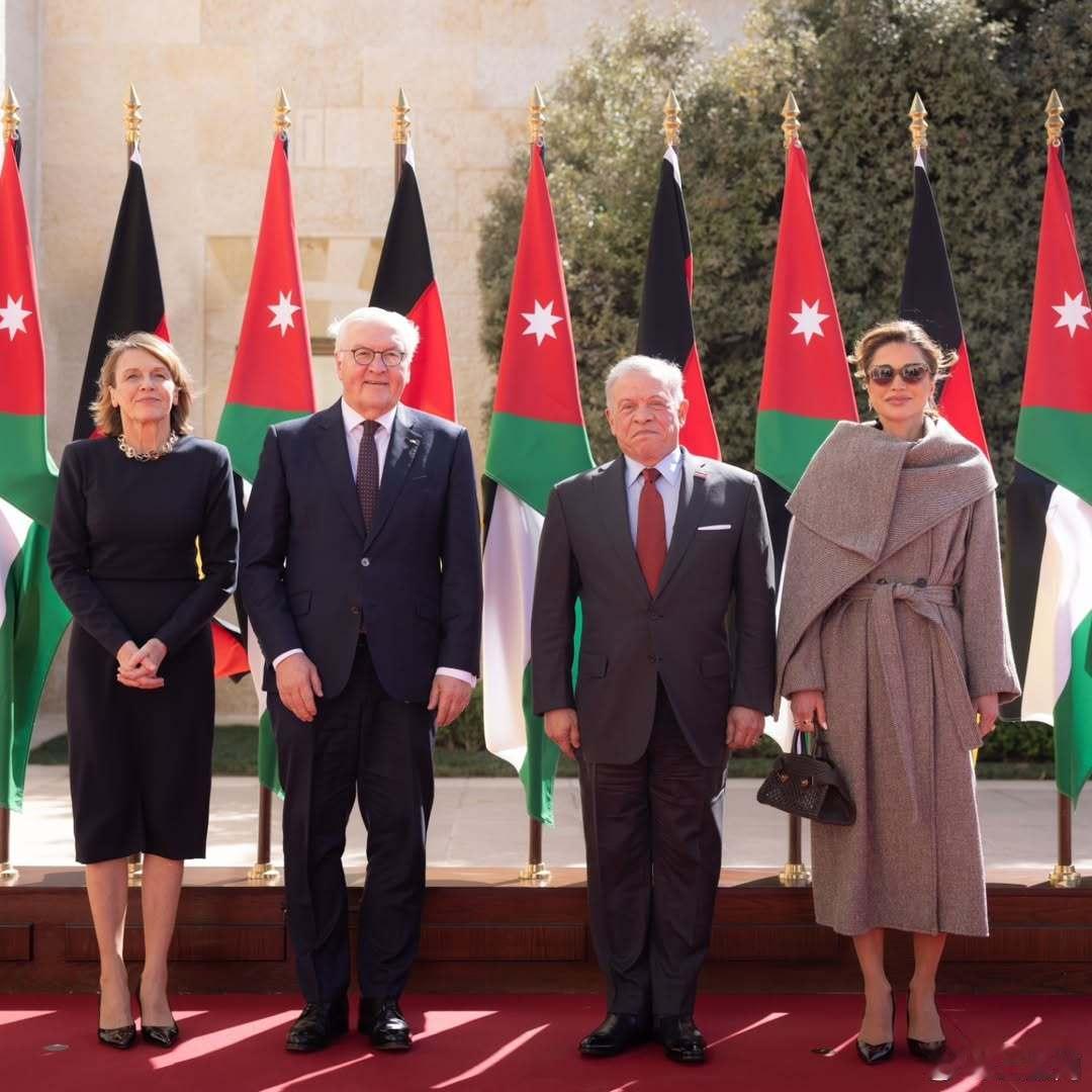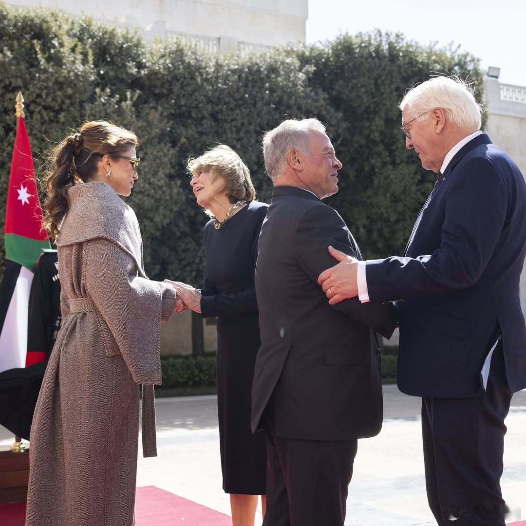 约旦王室 🇯🇴2月19日,德国总统弗兰克-瓦尔特·施泰因迈尔阁下和夫人埃尔克·比登本德国事访问约旦。世界各国王室拉尼亚王后的大衣和手提包来自菲拉格慕、内搭来自维多利亚·贝克汉姆、靴子来自Aquazzura。