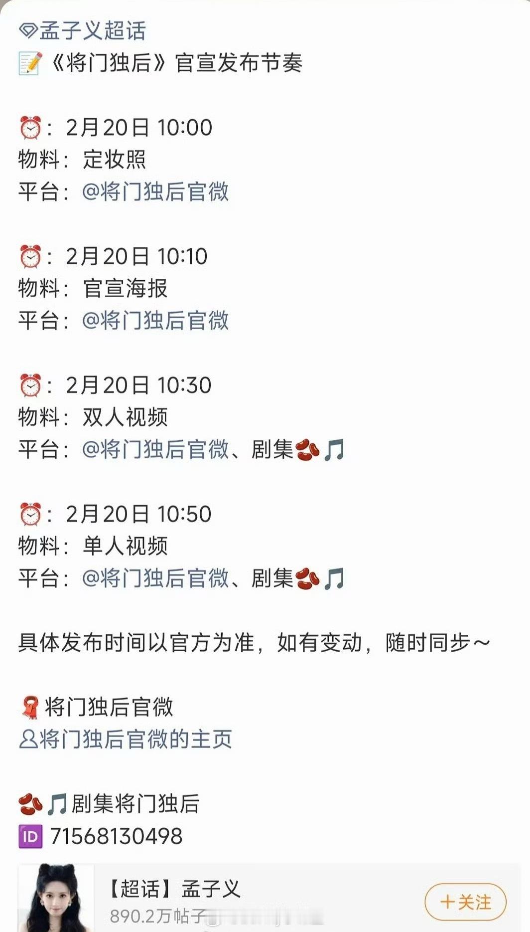将门毒后真要来了!孟子义对接公布将门独后官宣发布节奏,还有双人视频!坐等天经棣义营业