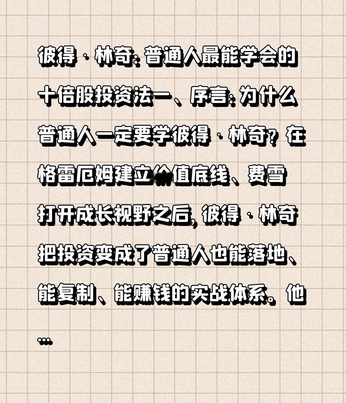 彼得·林奇:普通人最能学会的十倍股投资法 一、序言:为什么普通人一定要学彼得·林奇? 在格雷厄姆建立价值底线、费雪打开成长视野之后,彼得·林奇把投资变成了普通人也能落地、能复制、能赚钱的实战体系。 他不搞复杂理论,不玩高深模型,不讲玄学预测,只用最朴素的逻辑告诉全世界:专业机构并不比你厉害,你身边的生活,就是最好的选股雷达。 对于正在做短线、做热点、做强势股的投资者来说,林奇不是来否定短线,而是来补全认知——让我们知道:什么样的热点值得做,什么样的成长能走远,什么样的股票能从强势股变成十倍股。他是连接短线交易与长期价值的最佳桥梁。 二、林奇的底层信仰:投资不是赌博,是认知变现 彼得·林奇最核心的观点,只有三句话: 1. 股市短期是投票机,长期是称重机。短期涨跌看情绪,长期涨跌看公司。 2. 普通人拥有机构没有的优势:你能更早看到身边的爆款产品、热门品牌、新兴消费,而机构被流程、规模、规则束缚,永远慢半拍。 3. 不要预测市场,要研究公司。没人能精准预判明天涨跌,但你能判断一家公司好不好、贵不贵、有没有未来。 他彻底打破了“投资是精英游戏”的谎言,也告诉我们:赚钱不靠运气,靠方法、靠观察、靠纪律。 三、核心武器:林奇的六大公司分类法 林奇把所有股票分成六类,这是他选股的总纲,也是我们判断股票的第一标尺: 1. 快速增长型公司 林奇最偏爱、十倍股最集中的类型。小市值、高增速、新赛道、新模式,业绩持续爆发,股价不断创新高。 关键词:高成长、新行业、细分龙头、可复制。 2. 稳定增长型公司 大市值、慢但稳,比如消费、医药龙头。不会暴涨,但长期穿越牛熊,是组合的“压舱石”。 关键词:稳健、现金流、品牌、长期持有。 3. 周期型公司 钢铁、化工、有色、汽车、航运等,跟着经济周期大起大落。对时点要求极高,买对赚十倍,买错套三年。 关键词:看拐点、看供需、看宏观。 4. 困境反转型公司 曾经优秀,跌入低谷,因行业复苏、管理层更换、重组改革而起死回生。风险大,收益极高。 关键词:反转、重组、边际改善。 5. 缓慢增长型公司 公用事业、大型传统企业,增长很慢,波动很小,只适合防守,不适合进攻。 关键词:低风险、低收益、防御配置。 6. 隐蔽资产型公司 股价没反应出真实价值,拥有土地、股权、矿产、牌照、专利等被忽视的资产。 关键词:被低估、隐形资产、价值重估。 对我们实战的意义: 只做快速增长型,少量关注困境反转、稳定增长,其余三类不浪费时间。 四、林奇最牛的能力:从生活中发现十倍股 林奇最传奇的方法,就是生活选股法: 去超市看什么卖得好,去商场看什么店排队,看家人朋友用什么App,看上班族开什么车、喝什么饮料。 他的逻辑非常简单: 你能看懂的生意,才是你能赚到钱的生意。 同时他提出著名的鸡尾酒会理论,用来判断市场牛熊: 1. 没人愿意聊股票 → 市场底部 2. 有人聊但抱怨多 → 市场回暖 3. 人人都在聊股票 → 市场过热 4. 专家喊着涨到天 → 即将见顶 这一套,放在A股依然屡试不爽。 五、估值核心:PEG指标,不买贵的成长 林奇发明了最适合成长股的估值工具:PEG 公式:PEG = 市盈率PE ÷ 净利润增长率 1. PEG<1:低估,值得关注 2. PEG=1:合理,可持有 3. PEG>1:高估,小心追高 他的原则是:高成长可以给高估值,但不能无底线贵。 这正是我们做短线强势股最需要的: 看得懂成长,算得明白估值,不做接盘侠。 六、买卖铁律:什么时候买?什么时候卖? 买入时机 1. 公司基本面变好,市场还没反应 2. 强势股第一次回调到5日/10日均线 3. 行业低谷,优质公司被错杀 卖出时机(林奇三大卖出理由) 1. 公司基本面变坏,逻辑不在了 2. 股价严重高估,PEG远远大于1 3. 找到了更好、更便宜的标的 林奇最反对: 因为跌了就卖,因为涨了就拿;因为恐慌割肉,因为贪婪死拿。 他强调:股价涨跌不是买卖理由,公司好坏才是。 七、林奇给普通人的10条铁律: 1. 只投资你看得懂的行业与公司 2. 永远不要追高,等待合理价位 3. 快速增长型公司,是十倍股的唯一来源 4. 小公司机会大,大公司求稳健 5. 避开热门行业里的热门股 6. 持有股票数量不必多,精挑细选即可 7. 定期检查公司基本面,而不是天天盯盘 8. 接受波动,波动不是风险,无知才是 9. 不要相信预测,相信事实与数据 10. 长期坚持,复利比短期暴利更可怕 八、林奇思想与我们实战体系的融合 把林奇和我们正在用的强势牛股体系结合,就是最适合A股的打法: 1. 用林奇选方向:只做快速增长型行业 2. 用热点龙头选标的:只做龙一、龙二 3. 用PEG控估值:不追高、不接盘