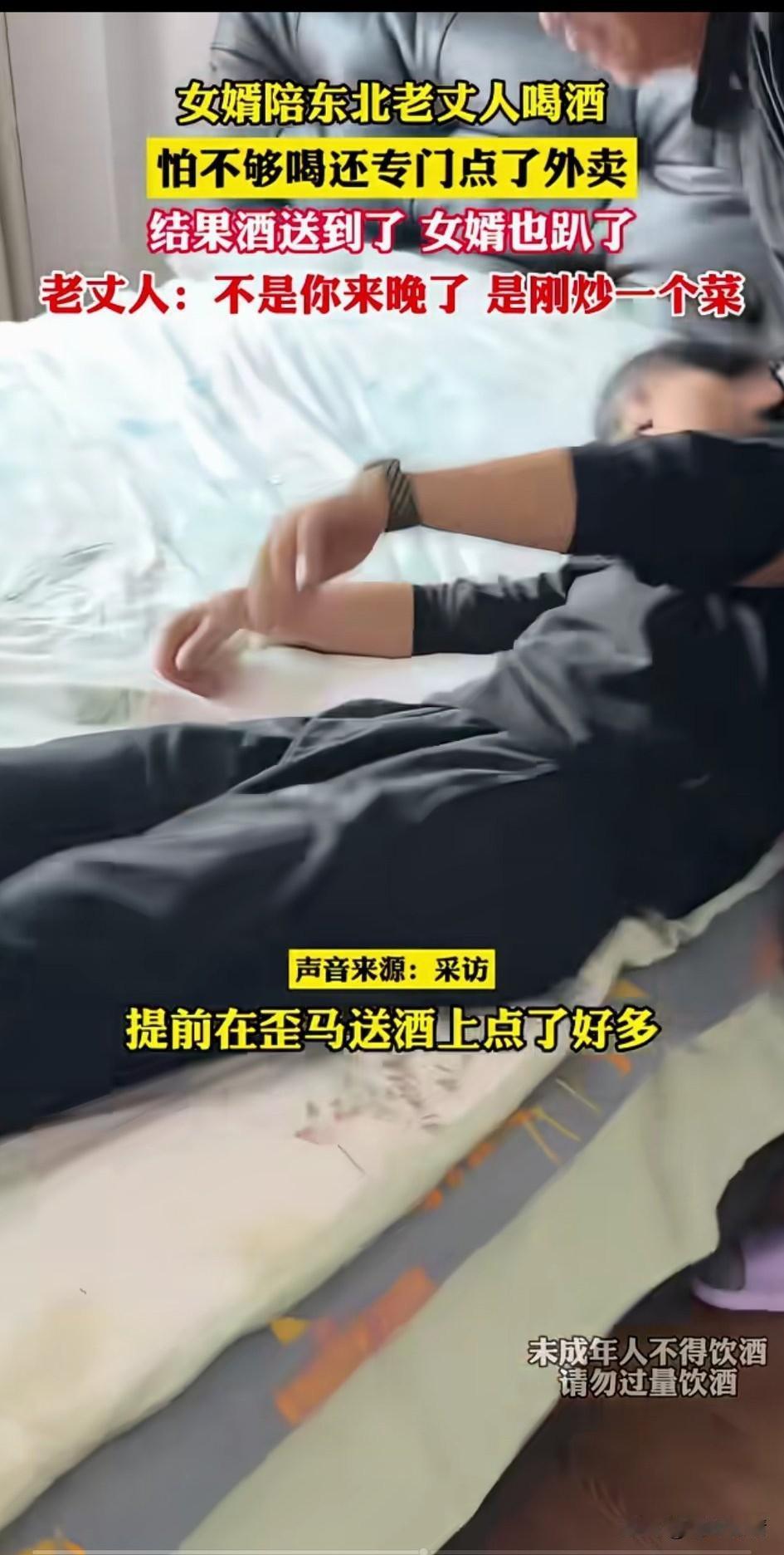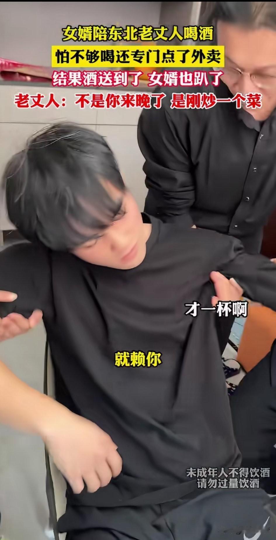 女婿过年回东北老丈人家, 夸下海口要陪老丈人喝到爽, 怕酒不够喝,还在网上点了酒, 家里刚炒了一个菜, 他就和老丈人对饮了一杯, 本想好好表现的他, 没想到自己酒力这么差, 一杯下肚直接就晕倒了, 可能你是平常白酒喝的少, 没想到老丈人喝的白酒度数这么高, 一杯直接将他干趴了, 不一会有人敲门, 我找人开门后才发现是送酒的外卖, 张口就说来晚了, 外卖员表示自己没有超时, 还提前几分钟到达? 老丈人说是他女婿一杯酒就干趴下, 这可把外卖员也都逗笑了, 网友纷纷表示,酒量不行还喝! 这话还不得老丈人把你抬上床! 东北的酒量果然好! 大家对于女婿被东北老丈人一杯酒干趴下怎么看? 女婿过年回家 女婿的过年礼 带女婿回家过年