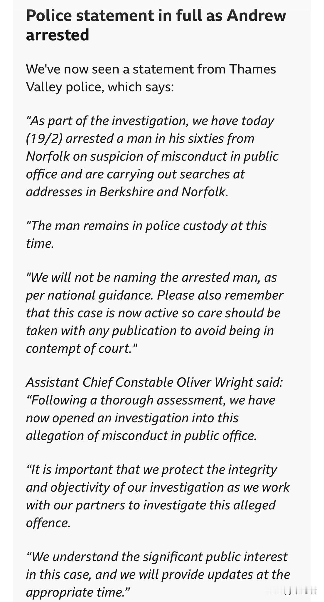 2026年2月19日(恰逢其66岁生日),安德鲁·蒙巴顿-温莎(前安德鲁王子)因涉嫌在担任公职期间行为不端(Misconduct in Public Office)被英国泰晤士河谷警方逮捕。 英国泰晤士河谷警方于2月19日在诺福克郡的桑德灵厄姆庄园(Sandringham Estate)将其逮捕,并对其在温莎和诺福克郡的多处住所进行了搜查。 最新披露的超过300万页美国司法部文件中包含的电子邮件显示,安德鲁在2010年至2011年担任英国国际贸易代表期间,涉嫌向杰弗里·爱泼斯坦发送了机密贸易报告,内容涉及对新加坡、香港和越南的官方访问细节以及关于阿富汗投资机会的敏感信息。 滥用影响力:证据表明他曾利用其官方职位和影响力,试图将爱泼斯坦介绍给权势人物并提供商业便利。 各方反应 英国王室:国王查尔斯三世发表声明表示“极度关切”,并强调“法律必须依法执行”,重申王室将全力配合调查。 法律后果:在英国,“公职人员行为不端”是一项极其严重的罪名,最高可判处终身监禁。 头衔变更:安德鲁已于2025年10月被剥夺了“王子”头衔、荣誉军衔和皇家赞助人身份,目前仅被称为安德鲁·蒙巴顿-温莎。