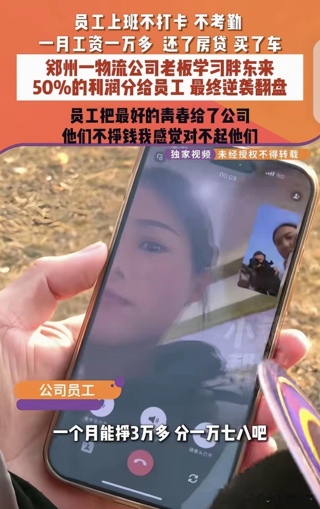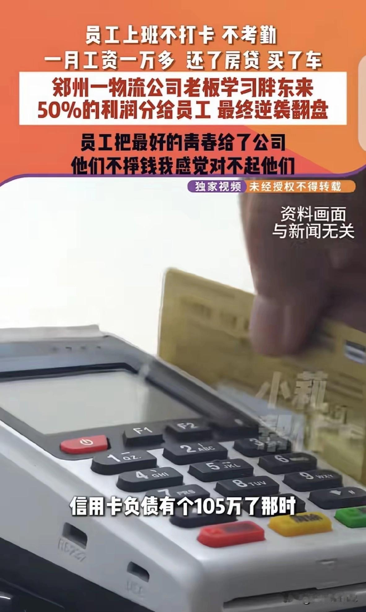 “活该你发财!”河南郑州,一男子创业失败,信用卡负债105万,他绝望了,2次想轻生,可自己有上有老下有小,死不起,他决定拼一把,开了家物流公司,学习“胖东来”,把50%利润都给员工,最终逆袭翻盘,不但把债还完,资产也变成正数,员工们每月能挣10000多。 把员工放在心上的老板,运气永远不会差。河南郑州的于先生,早年做货运司机维持生计,每月几千元的收入勉强支撑家庭开销,为了让家人过上更好的生活,他毅然投身物流行业自主创业, 本想凭借勤劳和踏实改变命运,却因市场环境变化、资金周转不畅等多重因素遭遇惨败,不仅投入的全部积蓄打了水漂,还欠下105万元的信用卡债务,人生瞬间跌入无边的黑暗。 那段时间,催债的电话和信息不分昼夜地打来,巨大的经济压力和精神折磨让他彻底崩溃,两次走到轻生的边缘,可一想到家中年迈的父母和年幼的孩子,上有老下有小的责任死死拉住了他, 他深知自己没有倒下的资格,哪怕再难也要咬牙撑下去。走投无路之际,他决定最后拼一次,重新打理起物流生意,只想靠自己的双手还清债务,给家人一个安稳的生活。 一次偶然的体验,让他接触到了暖心的经营理念,内心受到极大触动,他彻底改变传统的管理思路,决定把员工当成最珍贵的财富。 他将公司50%的利润直接分配给员工,同时取消所有打卡、考勤等严苛制度,不设条条框框,给予员工十足的信任与尊重。 他始终觉得,员工把人生最宝贵的青春奉献给公司,跟着自己打拼,若是不能让他们挣到钱、过上好日子,自己心里始终过意不去,这份朴素的初心,成了公司逆袭的起点。 最初的决定遭到不少质疑,同行觉得他疯了,员工也半信半疑,可他始终坚守承诺,用实际行动兑现分钱的约定。没有了严苛的约束,员工们反而爆发出极强的责任心与主动性, 不用监督就主动优化配送路线、提升服务效率,把公司的事当成自己的事来做,整个团队的凝聚力和战斗力大幅提升,公司的业务量和利润节节攀升,经营状况快速扭转。 短短时间内,于先生不仅还清了105万元的巨额债务,资产也由负转正,实现了稳定盈利。跟着他打拼的员工,每月收入都能达到一万多元, 靠着稳定可观的收入,不少员工还清了房贷、购置了私家车,彻底改变了生活状态,整个团队上下一心,形成了良性循环的发展格局。 他的逆袭故事被分享到网络后,瞬间刷屏全网,网友们纷纷留言点赞,各种真实的看法铺满评论区。 有网友直言活该他发财,真心换真心永远是最管用的生意经,把员工当家人的老板,注定能走得长远。 也有网友感慨,这才是学习经营理念的正确方式,不搞形式主义,不做表面功夫,把利润实实在在分给员工,利他就是最好的利己。 还有网友分享自己的职场经历,对比之下更觉得这样的老板难能可贵,信任与尊重比任何管理制度都更有力量,希望这样的经营模式能被更多企业学习。 还有不少网友为于先生的绝境翻盘点赞,负债百万不放弃,守住初心懂感恩,用善意和担当走出逆袭之路,给所有身处低谷的人带来了力量。 大家纷纷表示,做生意先做人,守住良心与真诚,哪怕起点再低、困境再难,终会迎来生活的馈赠。 从负债百万的绝望创业者,到被员工认可、被网友称赞的暖心老板,于先生用行动证明,善待他人、坚守初心,就是最成功的经营之道。 对此,你们有什么看法,欢迎评论留言~