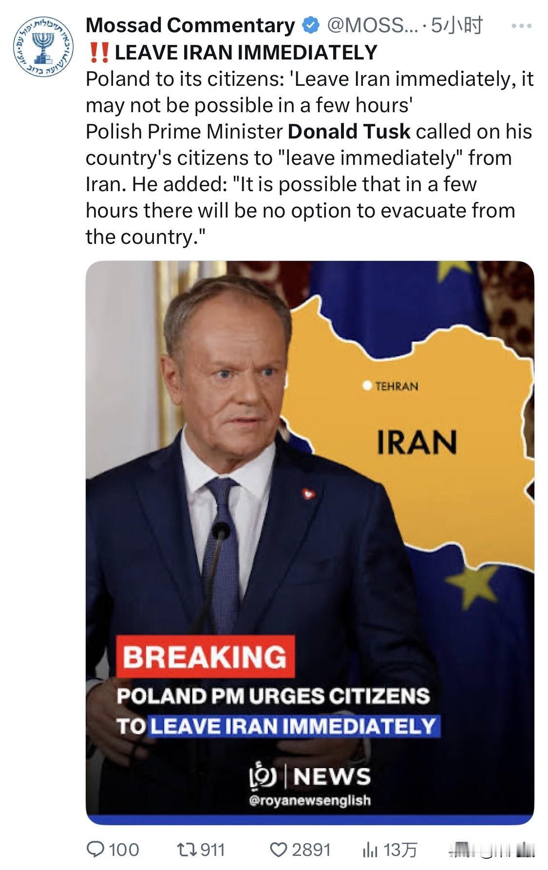 2026年2月19日,波兰总理唐纳德·图斯克(Donald Tusk)向身处伊朗的波兰公民发出极其紧急的撤离呼吁。他警告称,由于伊朗当前局势极度不稳定,发生激烈军事冲突的风险非常真实,在未来数小时或数十小时内,撤离行动可能将完全无法进行。 图斯克总理在华沙附近的杰隆卡(Zielonka)发表讲话,呼吁目前在伊朗的每一位波兰公民立即离开,并强烈建议计划前往伊朗的人员取消行程。 时间窗口紧迫: 他特别强调,再过“几个小时、十几个小时或几十个小时”,撤离可能就不再是选项,因为一旦爆发全面冲突,政府将无法保障公民的撤离路线。 图斯克明确指出,“发生激烈冲突的可能性非常高”,虽然他无意制造恐慌,但必须提醒民众认真对待此次预警。